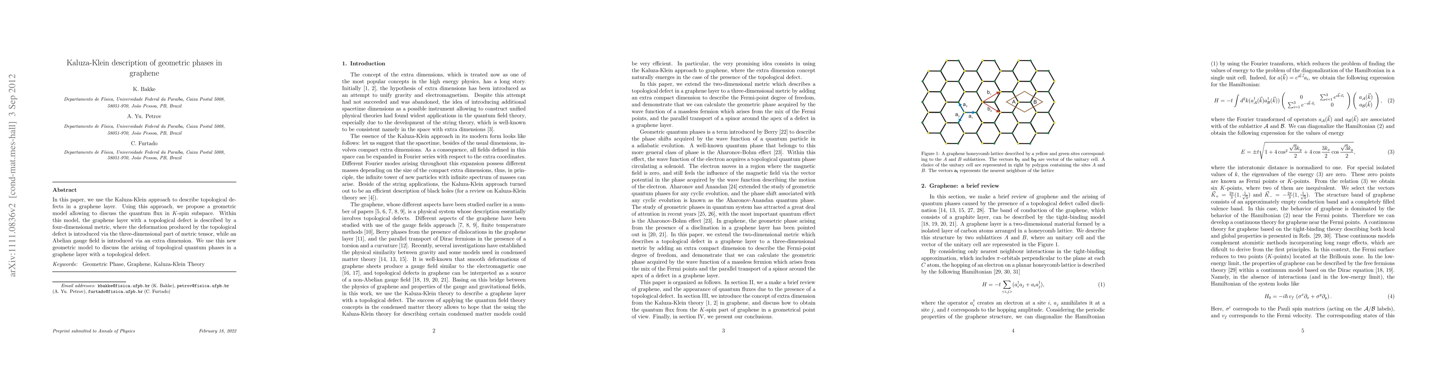 This paper employs the Kaluza-Klein method to analyze topological defects in graphene, proposing a geometric framework to describe quantum flux in the $K$-spin subspace. The model introduces a four-dimensional metric to represent the graphene layer, incorporating topological deformations and an Abelian gauge field, to explore the emergence of topological quantum phases.