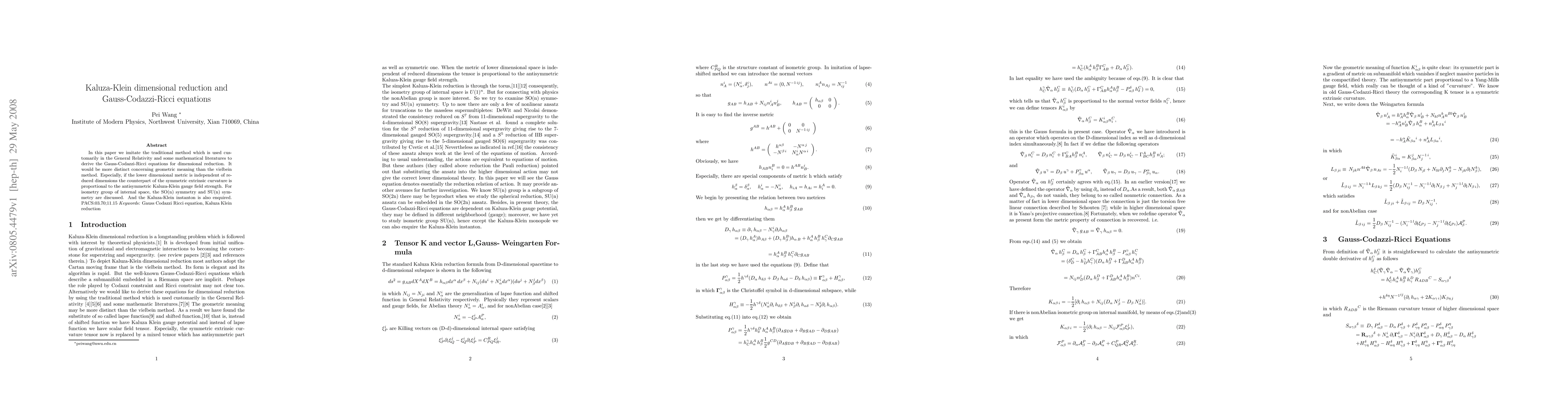 In this paper we imitate the traditional method which is used customarily in the General Relativity and some mathematical literatures to derive the Gauss-Codazzi-Ricci equations for dimensional reduction. It would be more distinct concerning geometric meaning than the vielbein method. Especially, if the lower dimensional metric is independent of reduced dimensions the counterpart of the symmetric extrinsic curvature is proportional to the antisymmetric Kaluza-Klein gauge field strength. For isometry group of internal space, the SO(n) symmetry and SU(n) symmetry are discussed. And the Kaluza-Klein instanton is also enquired.