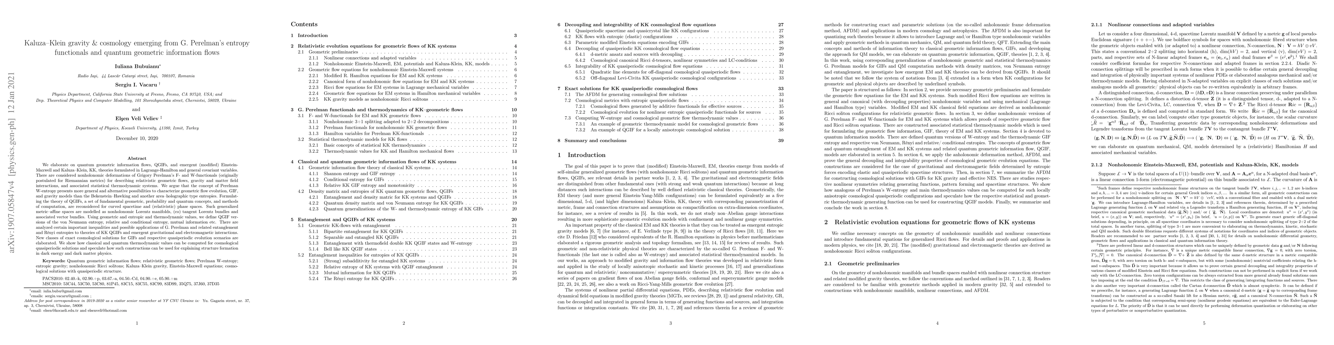 We elaborate on quantum geometric information flows, QGIFs, and emergent (modified) Einstein-Maxwell and Kaluza-Klein, KK, theories formulated in Lagrange-Hamilton and general covariant variables. There are considered nonholonomic deformations of Grigory Perelman's F- and W-functionals (originally postulated for Riemannian metrics) for describing relativistic geometric flows, gravity and matter field interactions, and associated statistical thermodynamic systems. We argue that the concept of Perelman W-entropy presents more general and alternative possibilities to characterize geometric flow evolution, GIF, and gravity models than the Bekenstein-Hawking and another area-holographic type entropies. Formulating the theory of QGIFs, a set of fundamental geometric, probability, and quantum concepts, and methods of computation, are reconsidered for curved spacetime and (relativistic) phase spaces. Such generalized metric-affine spaces are modeled as nonholonomic Lorentz manifolds, (co) tangent Lorentz bundles, and associated vector bundles. Using geometric and entropic and thermodynamic values, we define QGIF versions of the von Neumann entropy, relative and conditional entropy, mutual information, etc. There are analyzed certain important inequalities and possible applications of G. Perelman and related entanglement and R\'{e}nyi entropies to theories of KK QGIFs and emergent gravitational and electromagnetic interactions. New classes of exact cosmological solutions for GIFs and respective quasiperiodic evolution scenarios are elaborated. We show how classical and quantum thermodynamic values can be computed for cosmological quasiperiodic solutions and speculate how such constructions can be used for explaining structure formation in dark energy and dark matter physics.