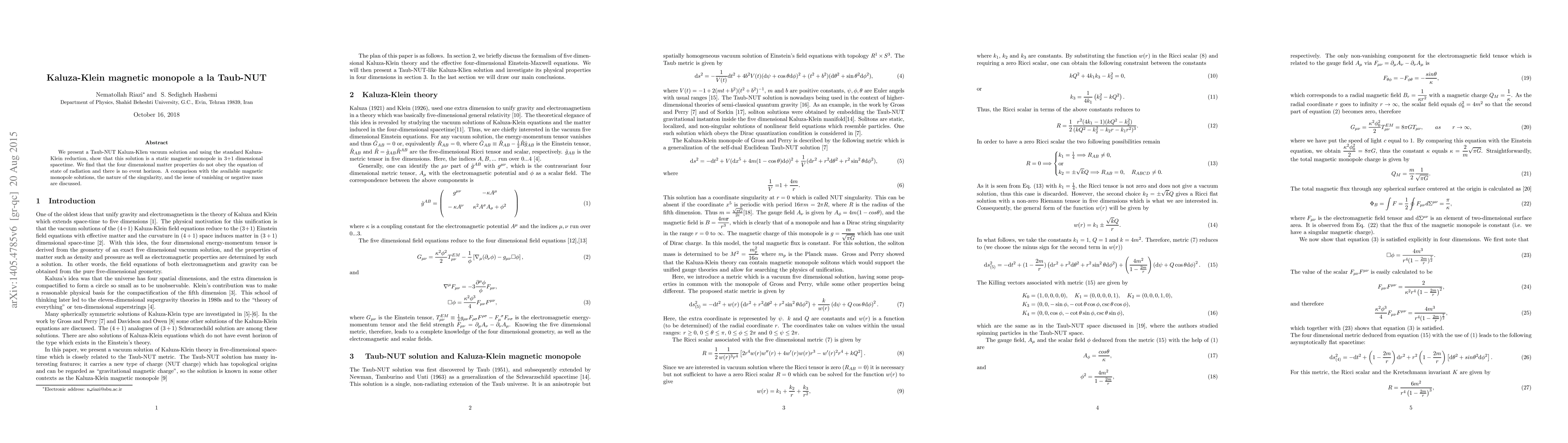 This paper presents a new vacuum solution in Kaluza-Klein theory resembling the Taub-NUT metric, revealing it to be a static magnetic monopole in four dimensions. The four-dimensional matter properties diverge from radiation state equations, and it lacks an event horizon.