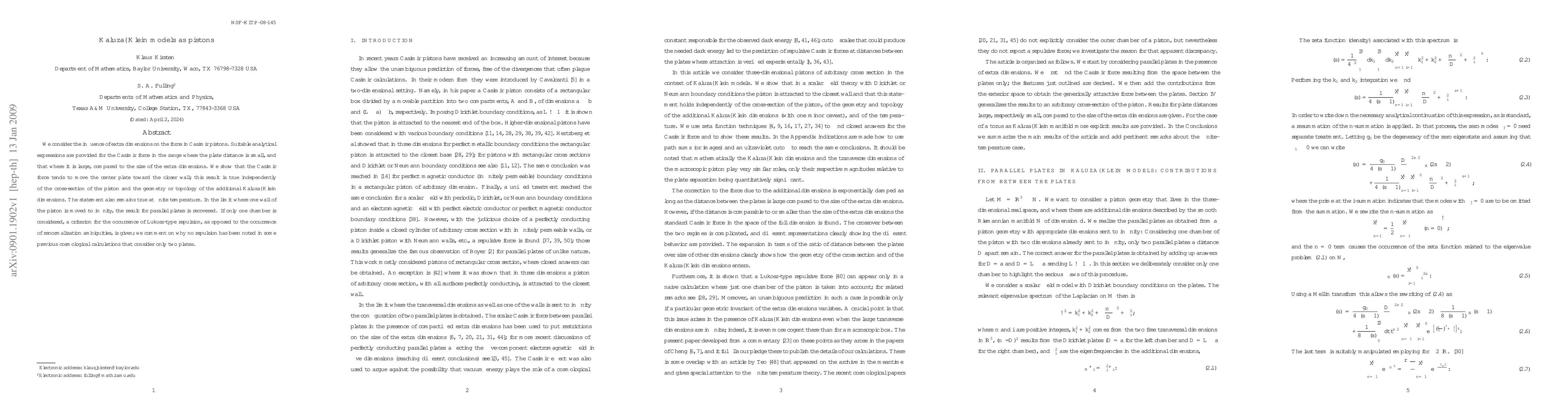We consider the influence of extra dimensions on the force in Casimir pistons. Suitable analytical expressions are provided for the Casimir force in the range where the plate distance is small, and that where it is large, compared to the size of the extra dimensions. We show that the Casimir force tends to move the center plate toward the closer wall; this result is true independently of the cross-section of the piston and the geometry or topology of the additional Kaluza--Klein dimensions. The statement also remains true at finite temperature. In the limit where one wall of the piston is moved to infinity, the result for parallel plates is recovered. If only one chamber is considered, a criterion for the occurrence of Lukosz-type repulsion, as opposed to the occurrence of renormalization ambiguities, is given; we comment on why no repulsion has been noted in some previous cosmological calculations that consider only two plates.