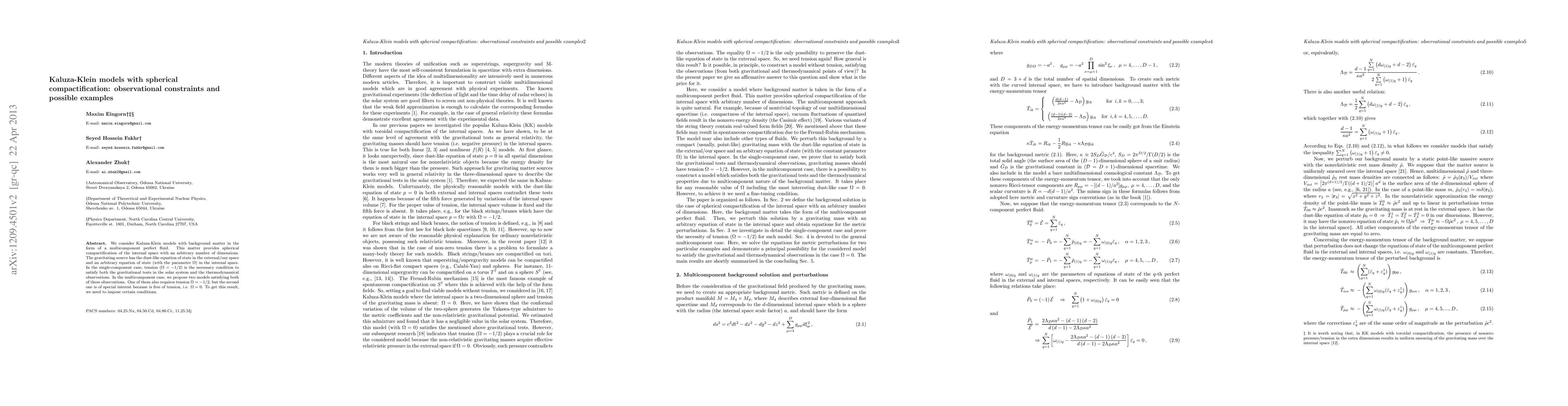 We consider Kaluza-Klein models with background matter in the form of a multicomponent perfect fluid. This matter provides spherical compactification of the internal space with an arbitrary number of dimensions. The gravitating source has the dust-like equation of state in the external/our space and an arbitrary equation of state (with the parameter $\Omega$) in the internal space. In the single-component case, tension ($\Omega=-1/2$) is the necessary condition to satisfy both the gravitational tests in the solar system and the thermodynamical observations. In the multicomponent case, we propose two models satisfying both of these observations. One of them also requires tension $\Omega=-1/2$, but the second one is of special interest because is free of tension, i.e. $\Omega=0$. To get this result, we need to impose certain conditions.