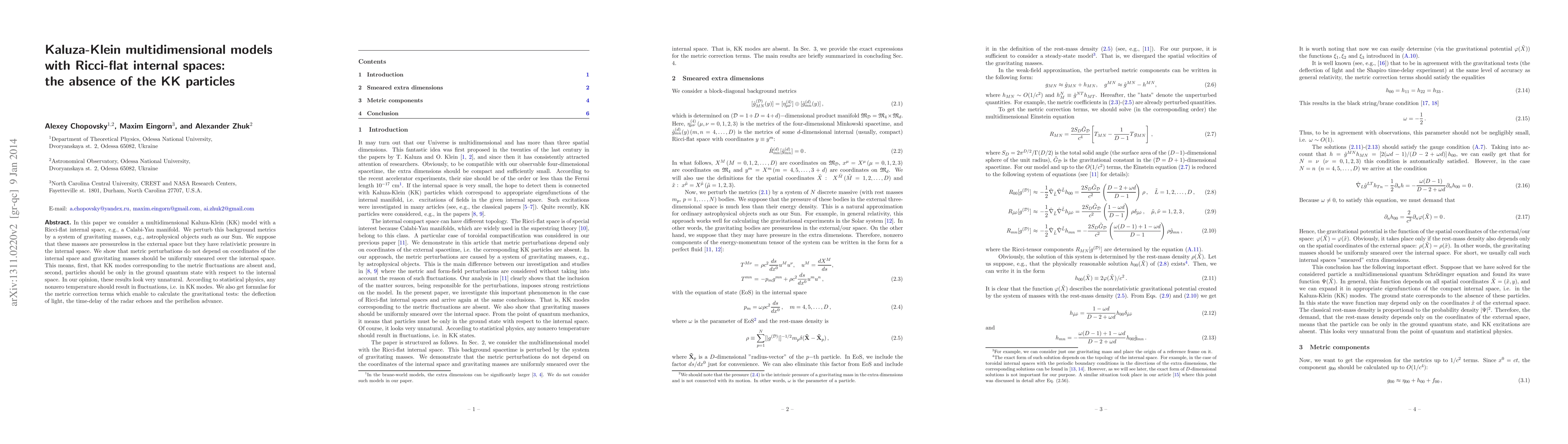 In this paper we consider a multidimensional Kaluza-Klein (KK) model with a Ricci-flat internal space, e.g., a Calabi-Yau manifold. We perturb this background metrics by a system of gravitating masses, e.g., astrophysical objects such as our Sun. We suppose that these masses are pressureless in the external space but they have relativistic pressure in the internal space. We show that metric perturbations do not depend on coordinates of the internal space and gravitating masses should be uniformly smeared over the internal space. This means, first, that KK modes corresponding to the metric fluctuations are absent and, second, particles should be only in the ground quantum state with respect to the internal space. In our opinion, these results look very unnatural. According to statistical physics, any nonzero temperature should result in fluctuations, i.e. in KK modes. We also get formulae for the metric correction terms which enable to calculate the gravitational tests: the deflection of light, the time-delay of the radar echoes and the perihelion advance.