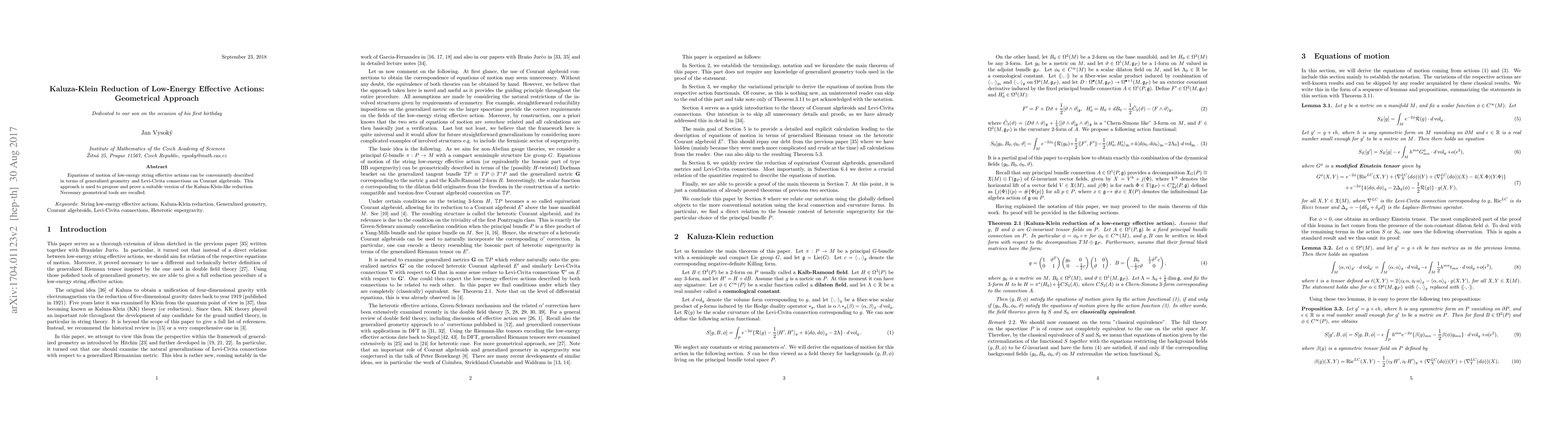 Summary: The paper proposes a Kaluza-Klein-like reduction for low-energy string effective actions using generalized geometry and Courant algebroids, demonstrating a geometrical approach to derive the necessary equations of motion. The methodology is supported by recalling relevant geometrical tools.
