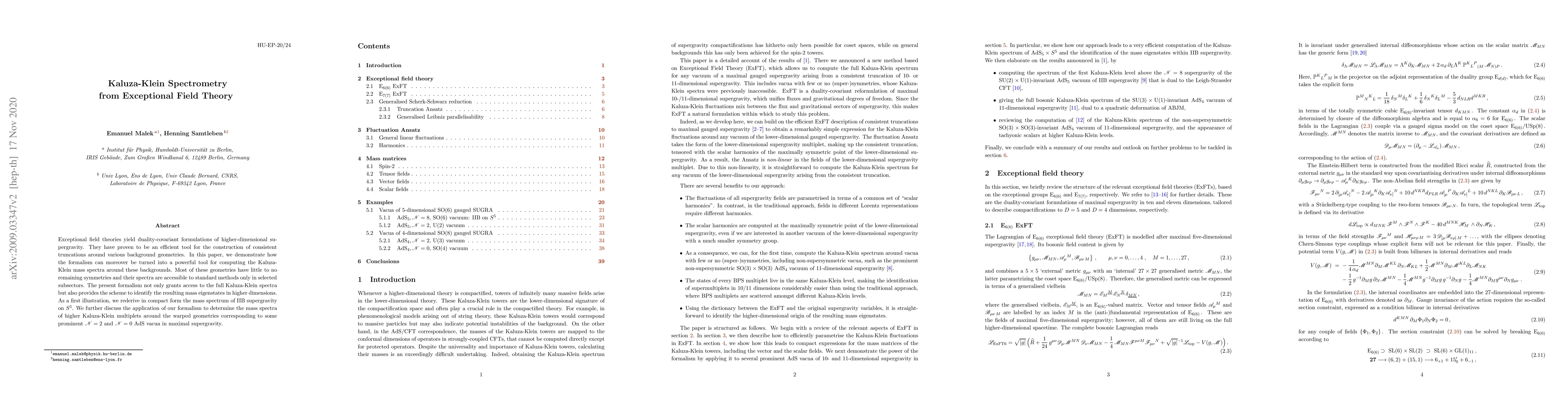 Exceptional field theories yield duality-covariant formulations of higher-dimensional supergravity. They have proven to be an efficient tool for the construction of consistent truncations around various background geometries. In this paper, we demonstrate how the formalism can moreover be turned into a powerful tool for computing the Kaluza-Klein mass spectra around these backgrounds. Most of these geometries have little to no remaining symmetries and their spectra are accessible to standard methods only in selected subsectors. The present formalism not only grants access to the full Kaluza-Klein spectra but also provides the scheme to identify the resulting mass eigenstates in higher dimensions. As a first illustration, we rederive in compact form the mass spectrum of IIB supergravity on $S^5$. We further discuss the application of our formalism to determine the mass spectra of higher Kaluza-Klein multiplets around the warped geometries corresponding to some prominent ${\cal N}=2$ and ${\cal N}=0$ AdS vacua in maximal supergravity.