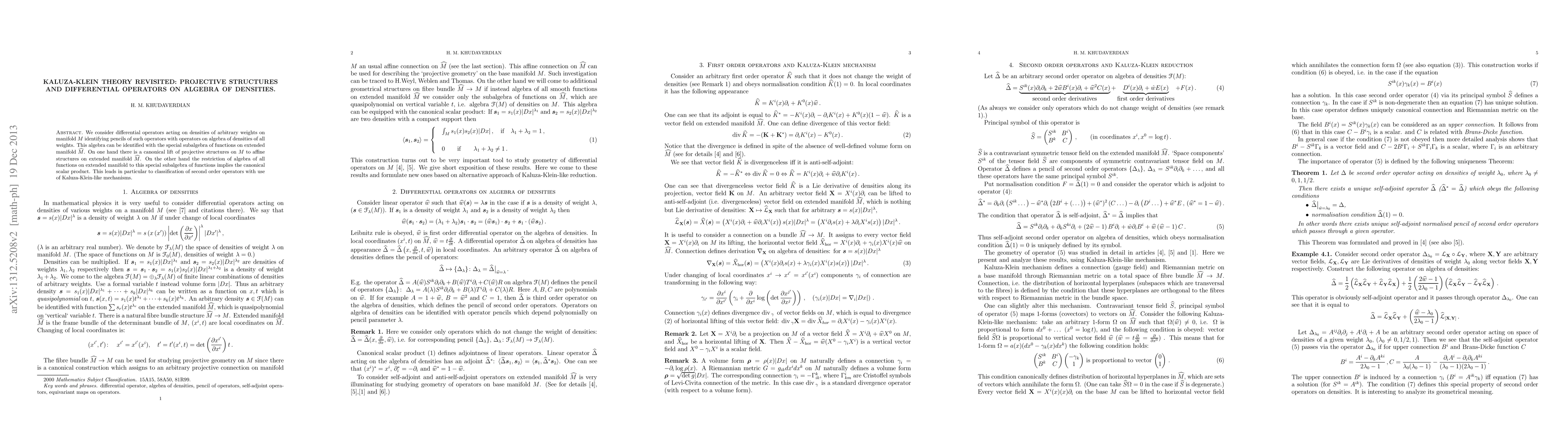 This paper revisits Kaluza-Klein theory by exploring differential operators on densities of manifold $M$ and their relation to projective structures on an extended manifold $\hat M$. It identifies these operators with functions on $\hat M$ and discusses the implications for classifying second-order operators using Kaluza-Klein mechanisms.