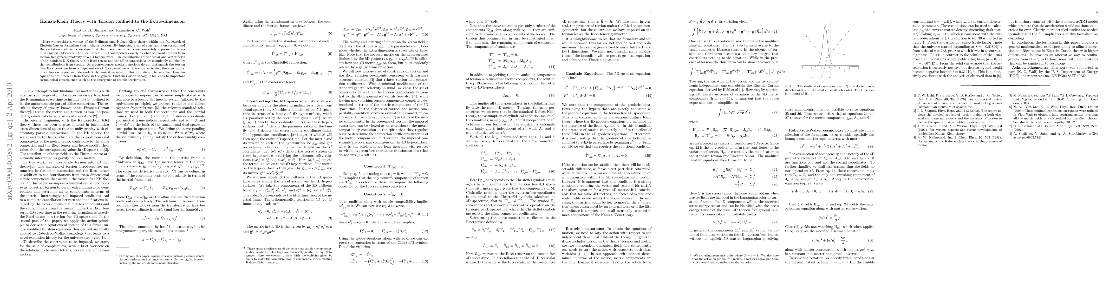 This paper explores a 5D Kaluza-Klein theory incorporating torsion within the Einstein-Cartan framework, showing torsion components are metric-dependent. The study reveals that torsion nullifies standard K-K theory contributions, leading to geodesic motions indistinguishable from torsion-free 4D space-time, and suggests cosmic acceleration as a cosmological consequence.