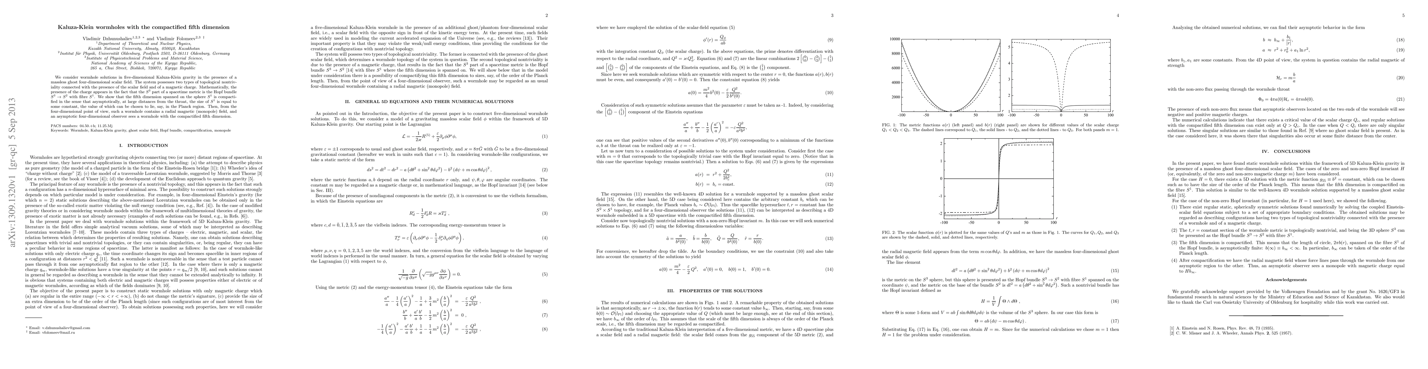 We consider wormhole solutions in five-dimensional Kaluza-Klein gravity in the presence of a massless ghost four-dimensional scalar field. The system possesses two types of topological nontriviality connected with the presence of the scalar field and of a magnetic charge. Mathematically, the presence of the charge appears in the fact that the $S^3$ part of a spacetime metric is the Hopf bundle $S^3 \rightarrow S^2$ with fibre $S^1$. We show that the fifth dimension spanned on the sphere $S^1$ is compactified in the sense that asymptotically, at large distances from the throat, the size of $S^1$ is equal to some constant, the value of which can be chosen to lie, say, in the Planck region. Then, from the four-dimensional point of view, such a wormhole contains a radial magnetic (monopole) field, and an asymptotic four-dimensional observer sees a wormhole with the compactified fifth dimension.