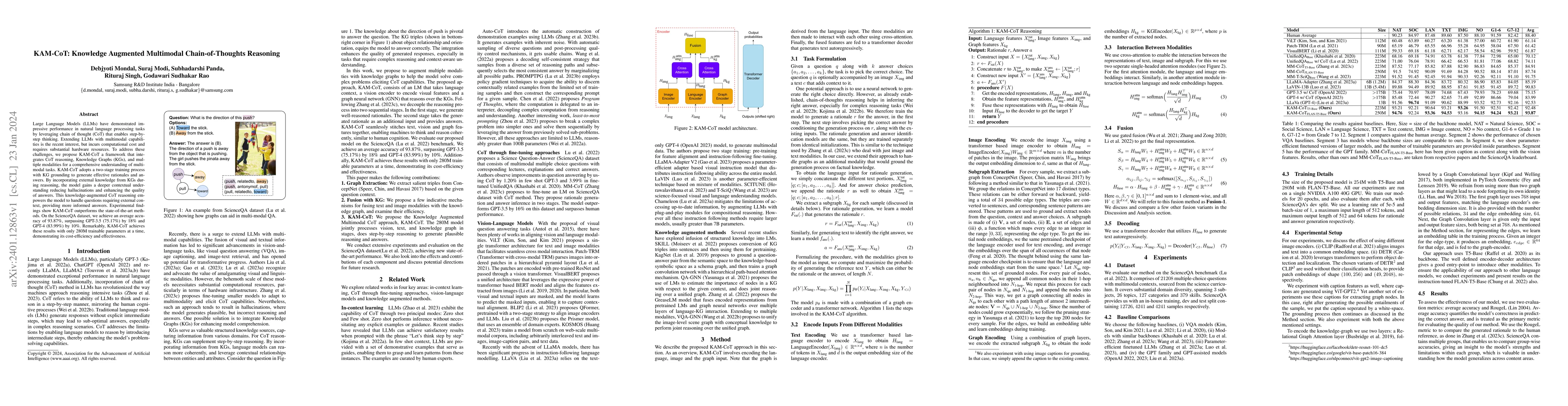 KAM-CoT integrates Knowledge Graphs with multimodal Chain-of-Thought reasoning to enhance large language models' performance on complex tasks, achieving superior accuracy with fewer parameters compared to state-of-the-art methods. The framework's two-stage training process leverages external knowledge to reduce errors and improve contextual understanding.