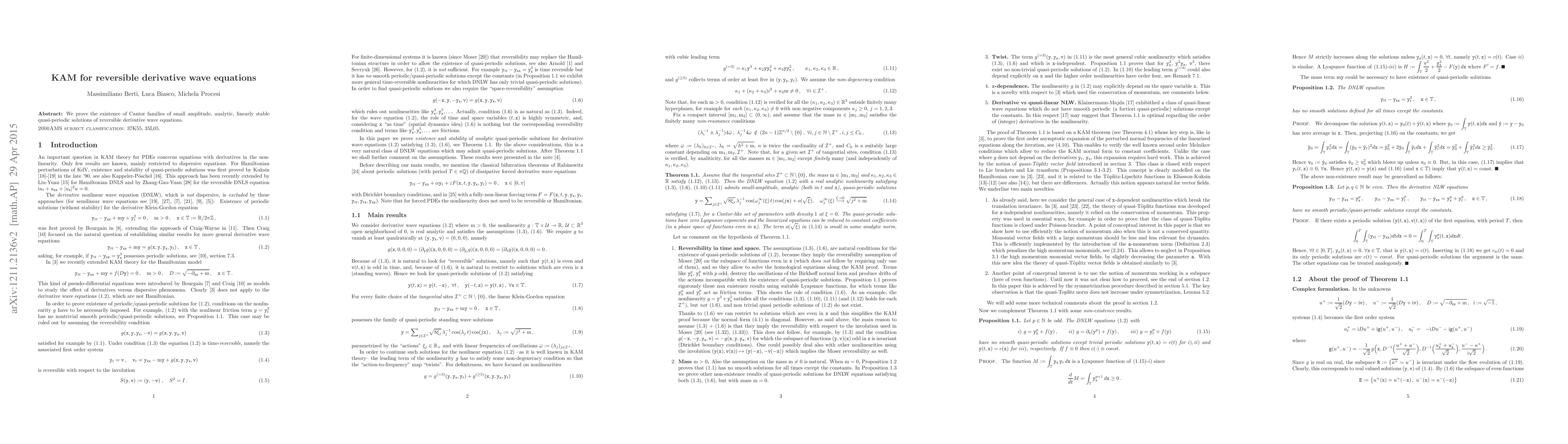 We prove the existence of Cantor families of small amplitude, analytic, quasi-periodic solutions of derivative wave equations, with zero Lyapunov exponents and whose linearized equation is reducible to constant coefficients. This result is derived by an abstract KAM theorem for infinite dimensional reversible dynamical systems