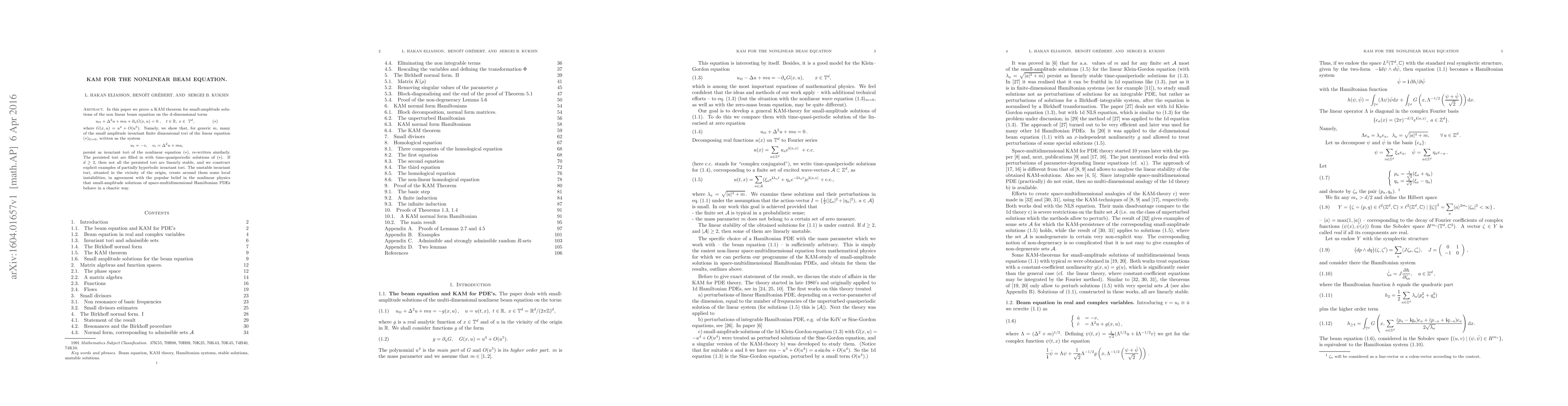 This paper proves a KAM theorem for small-amplitude solutions of the nonlinear beam equation on a d-dimensional torus, showing that many invariant tori from the linear equation persist in the nonlinear case, filled with quasi-periodic solutions. For dimensions d ≥ 2, some tori exhibit partial hyperbolicity, leading to local instabilities and chaotic behavior near the origin.