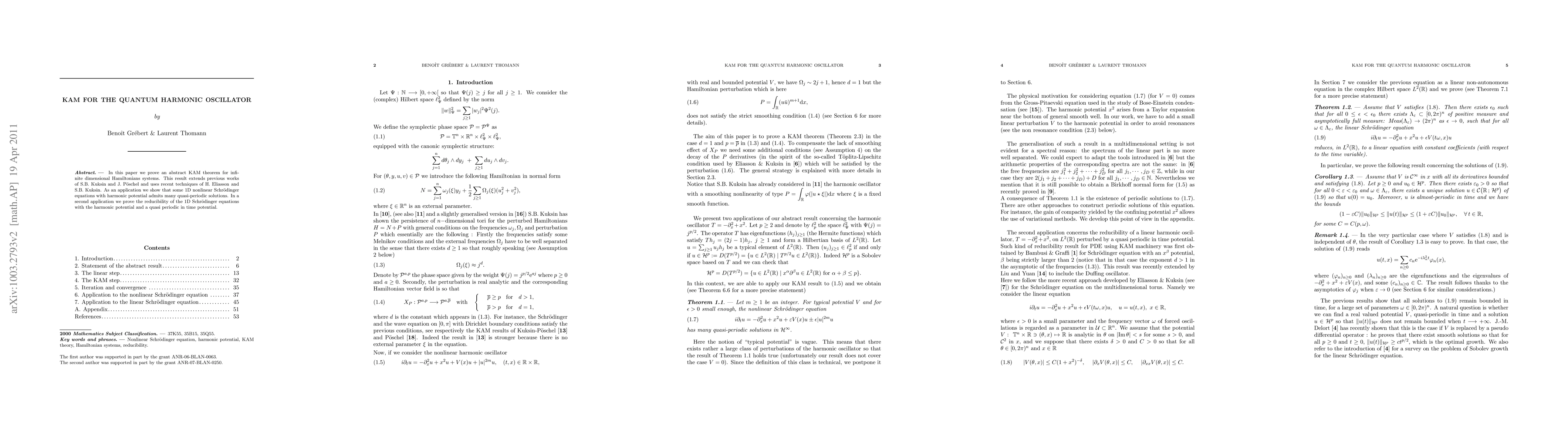 This paper extends the KAM theorem to infinite-dimensional Hamiltonian systems, applying recent techniques to demonstrate the existence of quasi-periodic solutions in 1D nonlinear Schrödinger equations with harmonic potential. Additionally, it proves the reducibility of 1D Schrödinger equations with harmonic and quasi-periodic time potentials.