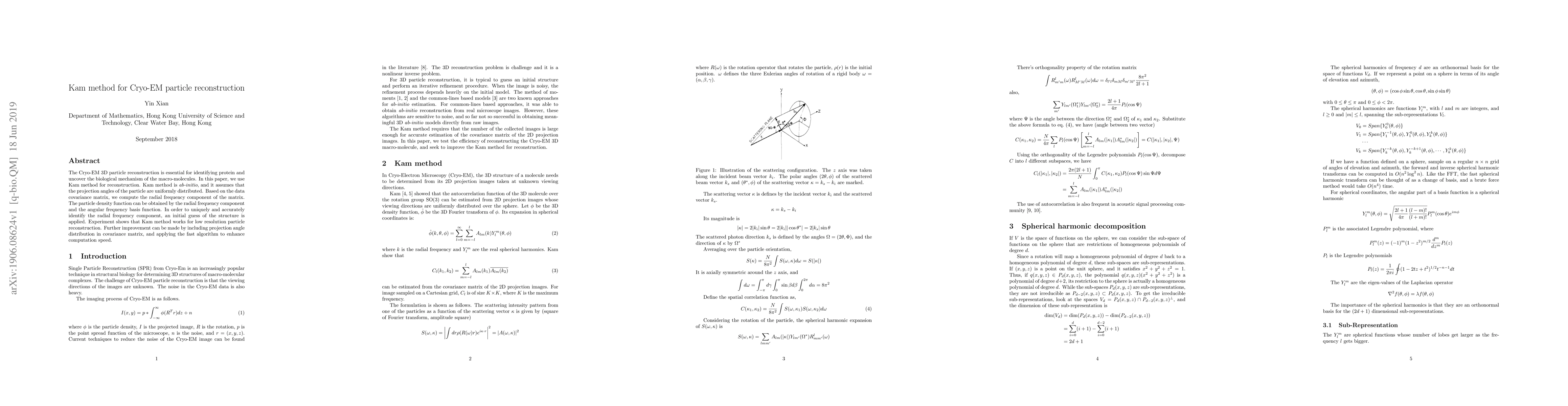 The Kam method offers an \textit{ab-initio} approach for Cryo-EM 3D particle reconstruction, utilizing data covariance matrices and radial frequency components. Initial experiments demonstrate its effectiveness for low-resolution reconstructions, with potential for further improvements through angle distribution inclusion and faster algorithms.