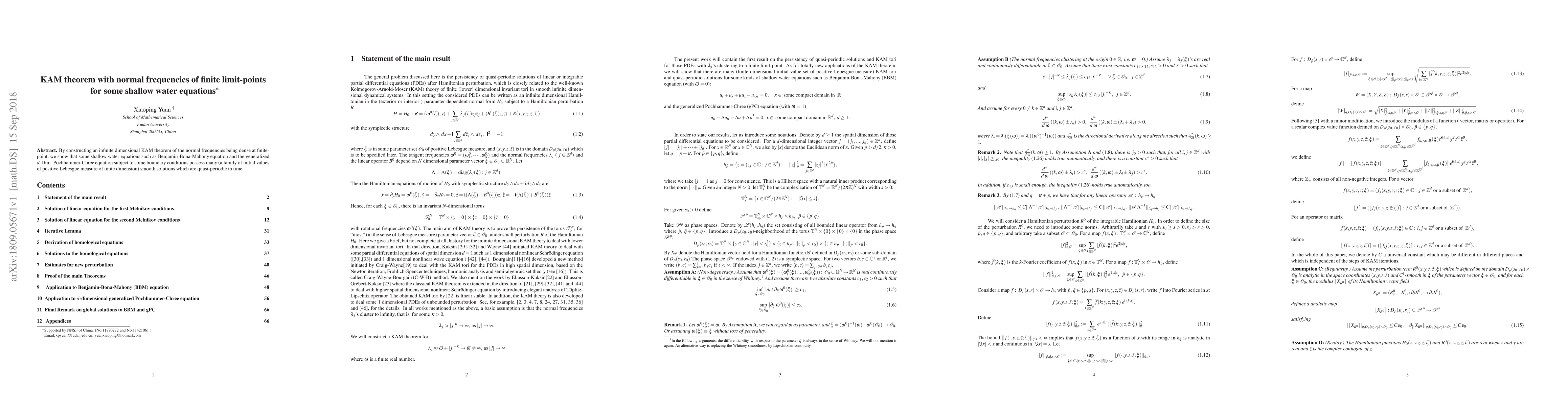 By constructing an infinite dimensional KAM theorem of the normal frequencies being dense at finite-point, we show that some shallow water equations such as Benjamin-Bona-Mahony equation and the generalized $d$-Dim. Pochhammer-Chree equation subject to some boundary conditions possess many (a family of initial values of positive Lebesgue measure of finite dimension) smooth solutions which are quasi-periodic in time.