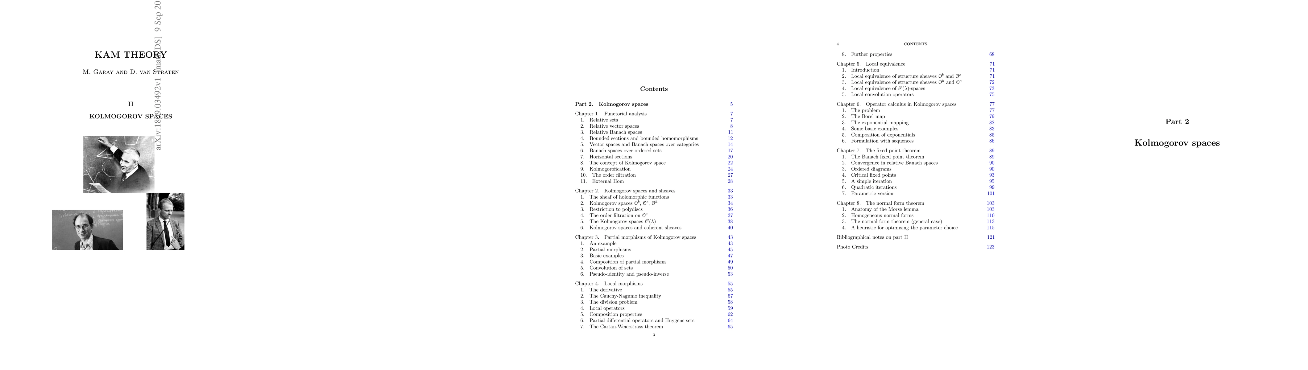 This is part II of our book on KAM theory. We start by defining functorial analysis and then switch to the particular case of Kolmogorov spaces. We develop functional calculus based on the notion of local operators. This allows to define the exponential and therefore relation between Lie algebra and Lie group actions in the infinite dimensional context. Then we introduce a notion of finite dimensional reduction and use it to prove a fixed point theorem for Kolmogorov spaces. We conclude by proving general normal theorems.