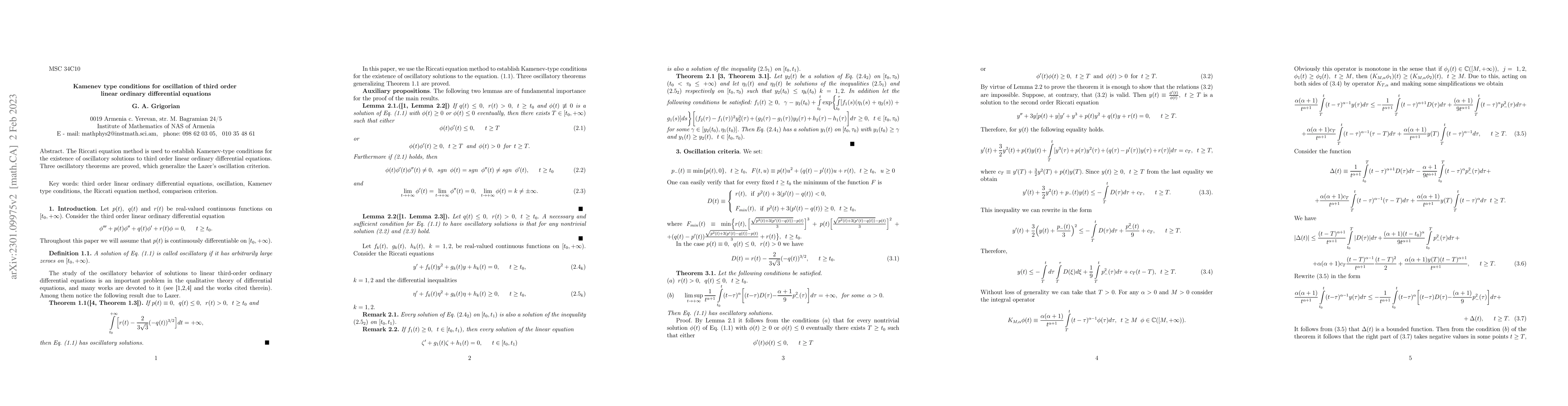 Summary: The paper establishes Kamenev type conditions for oscillatory solutions of third-order linear ordinary differential equations using the Riccati equation method. Three theorems generalize Lazer's oscillation criterion, extending the understanding of such oscillations.