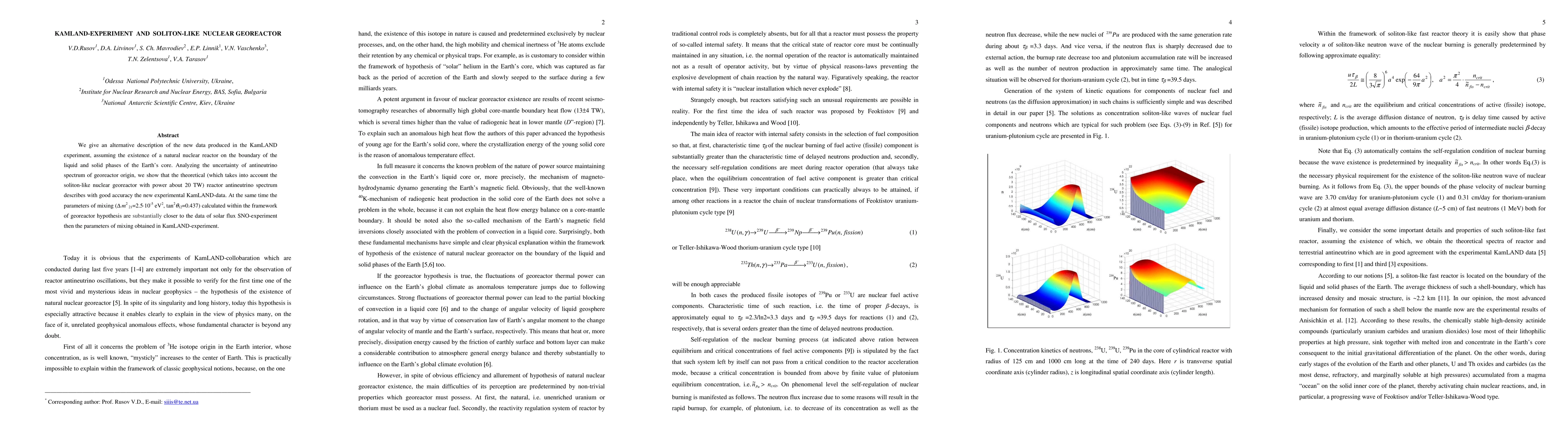 The KamLAND experiment's new data is reinterpreted to suggest the existence of a natural nuclear reactor near the boundary of Earth's liquid and solid core, modeled as a soliton-like georeactor. This georeactor's antineutrino spectrum closely matches the experimental data and provides mixing parameters more aligned with solar flux data from the SNO experiment.