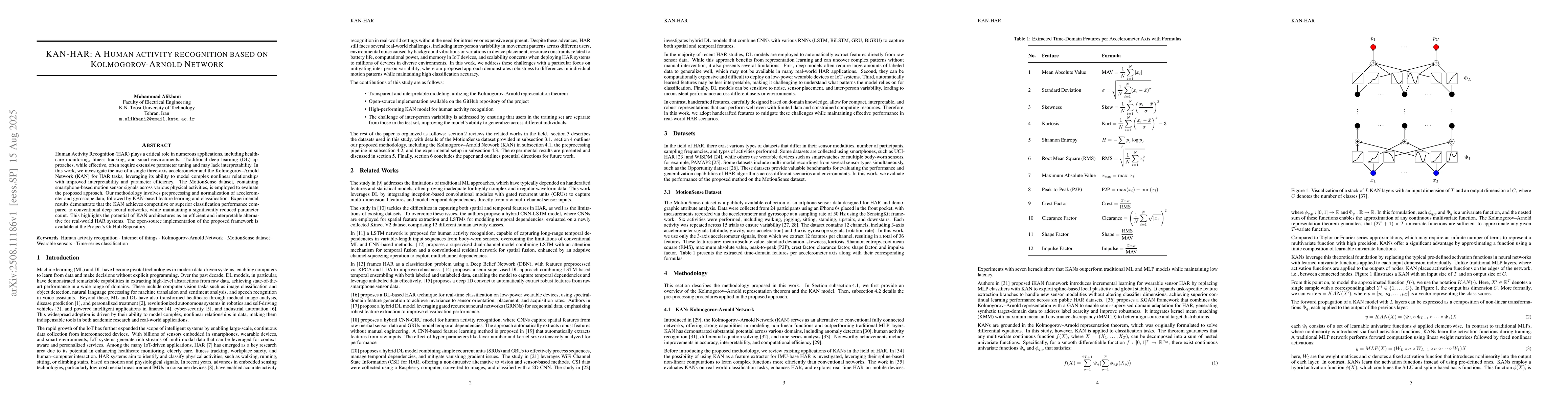 Human Activity Recognition (HAR) plays a critical role in numerous applications, including healthcare monitoring, fitness tracking, and smart environments. Traditional deep learning (DL) approaches, while effective, often require extensive parameter tuning and may lack interpretability. In this work, we investigate the use of a single three-axis accelerometer and the Kolmogorov--Arnold Network (KAN) for HAR tasks, leveraging its ability to model complex nonlinear relationships with improved interpretability and parameter efficiency. The MotionSense dataset, containing smartphone-based motion sensor signals across various physical activities, is employed to evaluate the proposed approach. Our methodology involves preprocessing and normalization of accelerometer and gyroscope data, followed by KAN-based feature learning and classification. Experimental results demonstrate that the KAN achieves competitive or superior classification performance compared to conventional deep neural networks, while maintaining a significantly reduced parameter count. This highlights the potential of KAN architectures as an efficient and interpretable alternative for real-world HAR systems. The open-source implementation of the proposed framework is available at the Project's GitHub Repository.