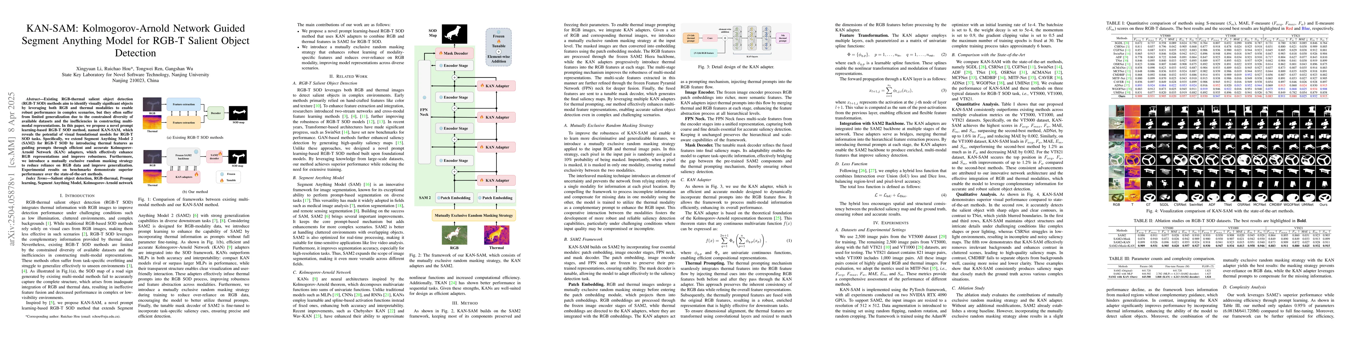 This paper proposes a novel RGB-T salient object detection method called KAN-SAM that uses visual foundational models to improve performance and generalization. It achieves superior results over state-of-the-art methods by leveraging thermal features as guiding prompts and reducing reliance on RGB data.