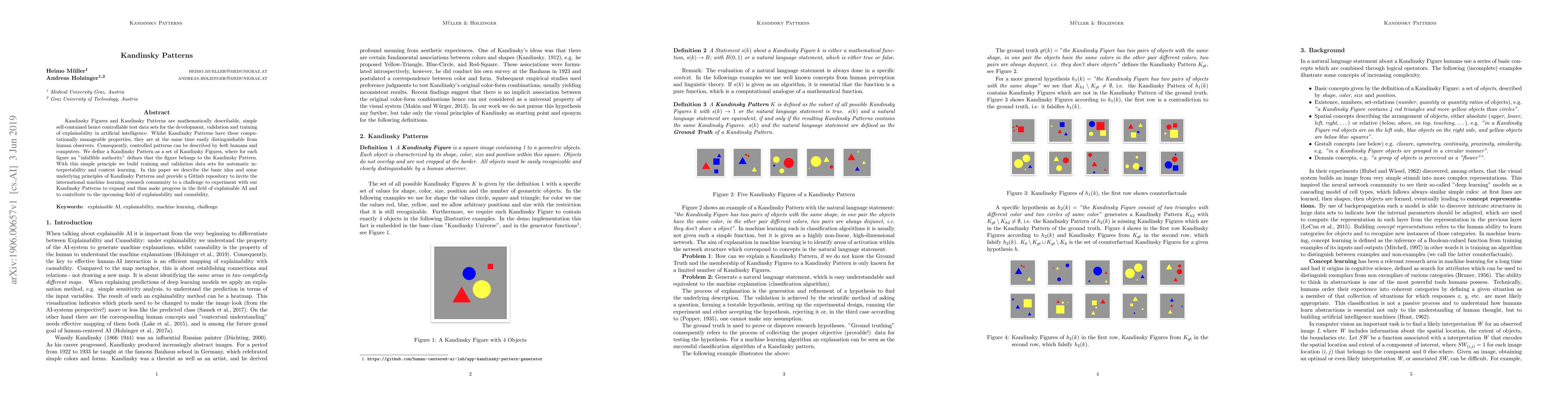 The paper introduces Kandinsky Patterns and Kandinsky Figures as computationally manageable, easily distinguishable test data sets for AI explainability development, validation, and training. These patterns are defined by an 'infallible authority' determining figure membership in a pattern, enabling both human and computer description.