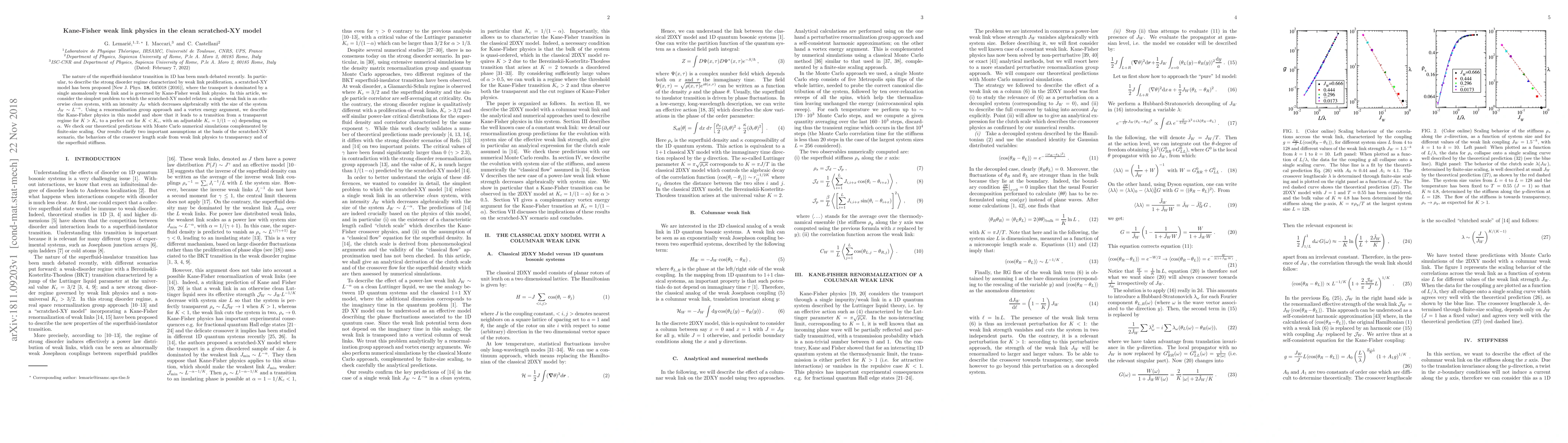 The paper presents a detailed analysis of Kane-Fisher weak link physics in a clean scratched-XY model, providing a renormalization group approach and vortex energy argument to describe the transition from a transparent regime to a perfect cut, with an adjustable critical point K_c = 1 / (1 - α) depending on α.