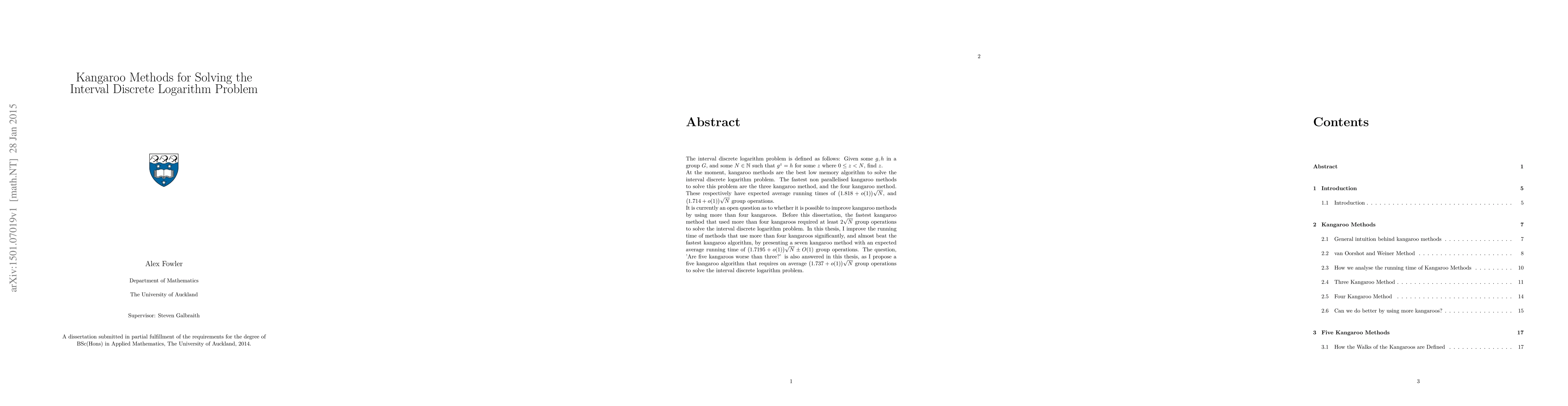 The interval discrete logarithm problem is defined as follows: Given some $g,h$ in a group $G$, and some $N \in \mathbb{N}$ such that $g^z=h$ for some $z$ where $0 \leq z < N$, find $z$. At the moment, kangaroo methods are the best low memory algorithm to solve the interval discrete logarithm problem. The fastest non parallelised kangaroo methods to solve this problem are the three kangaroo method, and the four kangaroo method. These respectively have expected average running times of $\big(1.818+o(1)\big)\sqrt{N}$, and $\big(1.714 + o(1)\big)\sqrt{N}$ group operations. It is currently an open question as to whether it is possible to improve kangaroo methods by using more than four kangaroos. Before this dissertation, the fastest kangaroo method that used more than four kangaroos required at least $2\sqrt{N}$ group operations to solve the interval discrete logarithm problem. In this thesis, I improve the running time of methods that use more than four kangaroos significantly, and almost beat the fastest kangaroo algorithm, by presenting a seven kangaroo method with an expected average running time of $\big(1.7195 + o(1)\big)\sqrt{N} \pm O(1)$ group operations. The question, 'Are five kangaroos worse than three?' is also answered in this thesis, as I propose a five kangaroo algorithm that requires on average $\big(1.737+o(1)\big)\sqrt{N}$ group operations to solve the interval discrete logarithm problem.