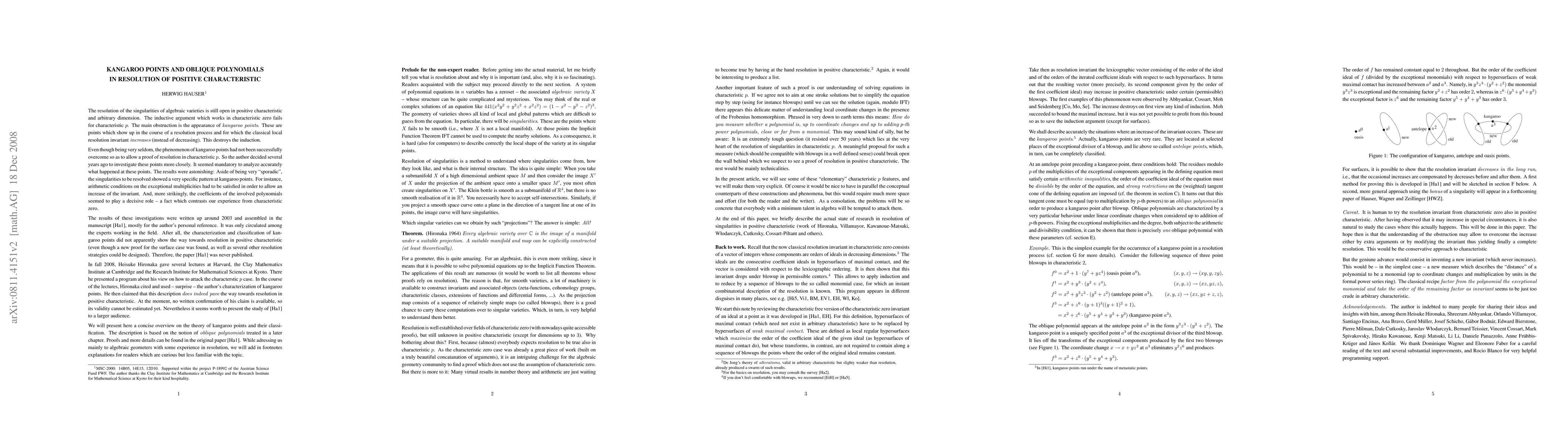 Updated version. Includes comments on the advances in the field from the Kyoto workshop on Resolution of Singularities in Positive Characteristic, December 2008. The article surveys the theory of kangaroo points as they appear in the resolution of singularities in positive characteristic. They represent one of the main obstructions for transcribing the characteristic zero proof of resolution to positive characteristic. Kangaroo points are classified through the concept of oblique polynomials. The results of the article are used in Hironaka's recent program towards the resolution of singularities in positive characteristic.
