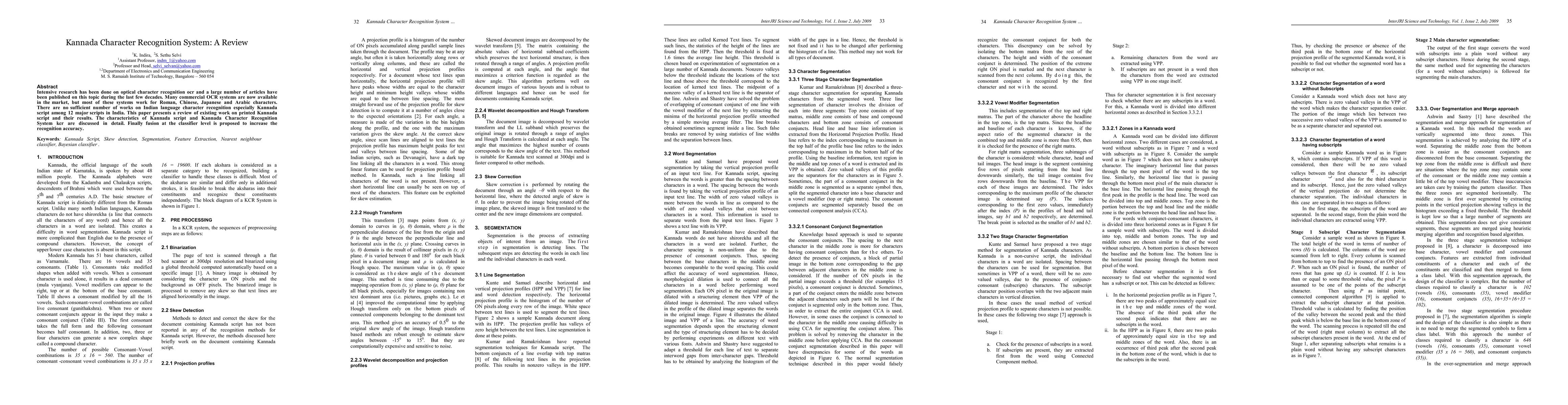 Intensive research has been done on optical character recognition ocr and a large number of articles have been published on this topic during the last few decades. Many commercial OCR systems are now available in the market, but most of these systems work for Roman, Chinese, Japanese and Arabic characters. There are no sufficient number of works on Indian language character recognition especially Kannada script among 12 major scripts in India. This paper presents a review of existing work on printed Kannada script and their results. The characteristics of Kannada script and Kannada Character Recognition System kcr are discussed in detail. Finally fusion at the classifier level is proposed to increase the recognition accuracy.