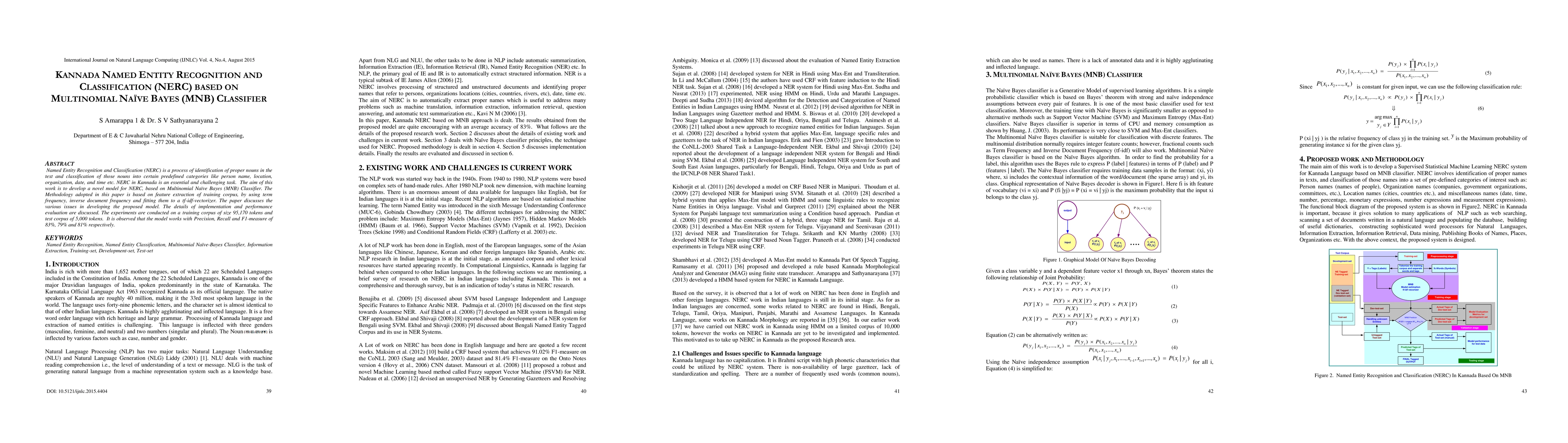 This paper develops a Multinomial Naive Bayes classifier for Kannada Named Entity Recognition and Classification (NERC), achieving Precision, Recall, and F1-measure of 83%, 79%, and 81% respectively on a corpus of 95,170 training tokens and 5,000 test tokens. The model utilizes tf-idf vectorizer for feature extraction.
