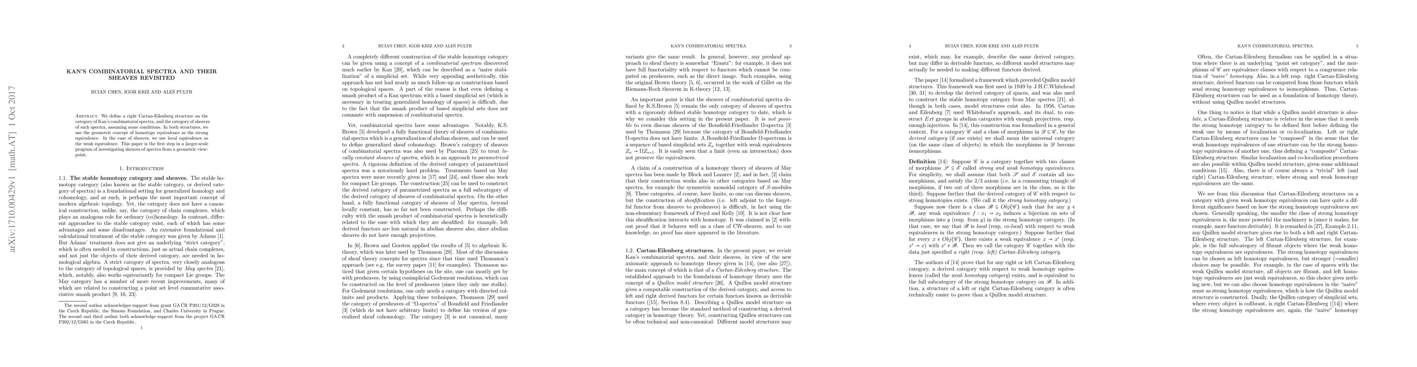 We define a right Cartan-Eilenberg structure on the category of Kan's combinatorial spectra, and the category of sheaves of such spectra, assuming some conditions. In both structures, we use the geometric concept of homotopy equivalence as the strong equivalence. In the case of sheaves, we use local equivalence as the weak equivalence. This paper is the first step in a larger-scale program of investigating sheaves of spectra from a geometric viewpoint.