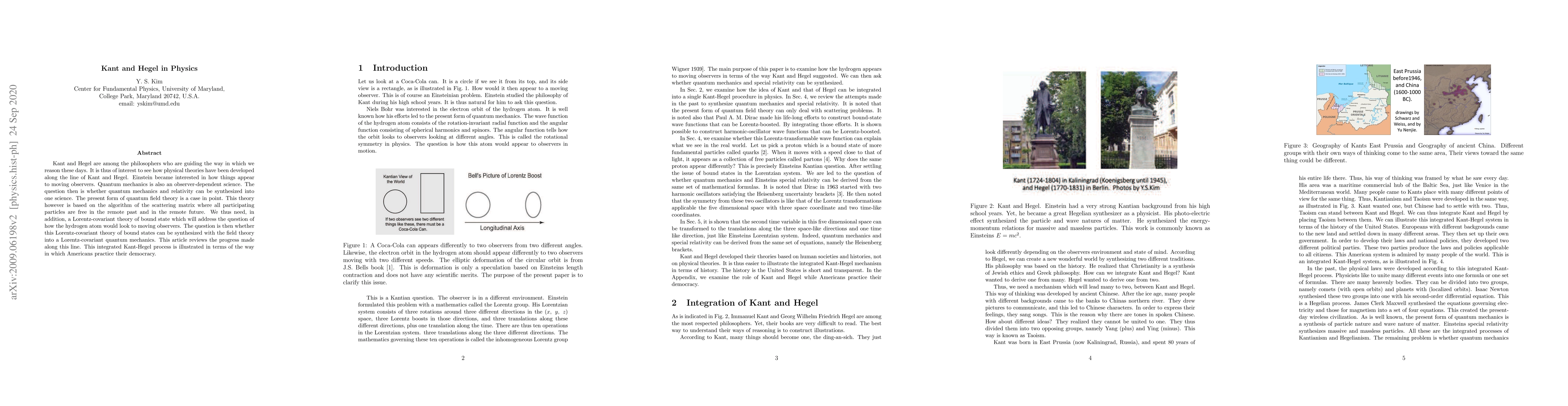 Kant and Hegel are among the philosophers who are guiding the way in which we reason these days. It is thus of interest to see how physical theories have been developed along the line of Kant and Hegel. Einstein became interested in how things appear to moving observers. Quantum mechanics is also an observer-dependent science. The question then is whether quantum mechanics and relativity can be synthesized into one science. The present form of quantum field theory is a case in point. This theory however is based on the algorithm of the scattering matrix where all participating particles are free in the remote past and in the remote future. We thus need, in addition, a Lorentz-covariant theory of bound state which will address the question of how the hydrogen atom would look to moving observers. The question is then whether this Lorentz-covariant theory of bound states can be synthesized with the field theory into a Lorentz-covariant quantum mechanics. This article reviews the progress made along this line. This integrated Kant-Hegel process is illustrated in terms of the way in which Americans practice their democracy.