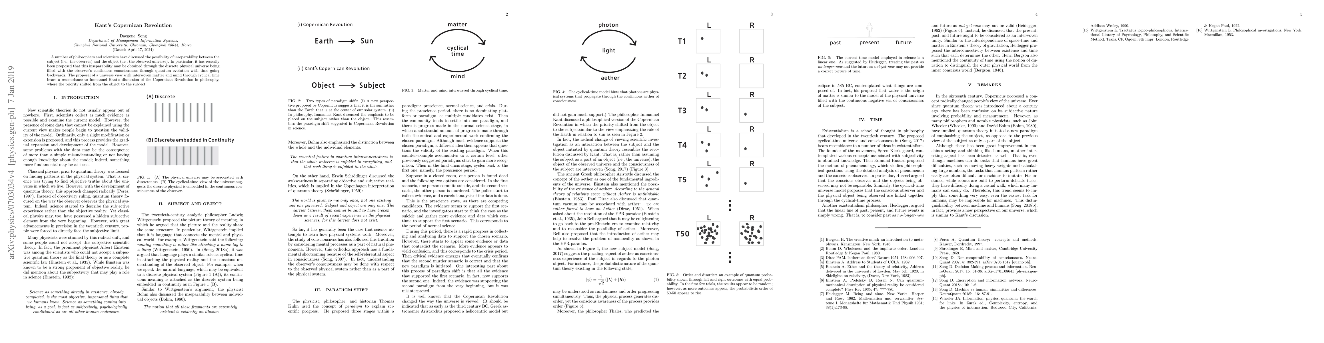 A number of philosophers and scientists have discussed the possibility of inseparability between the subject (i.e., the observer) and the object (i.e., the observed universe). In particular, it has recently been proposed that this inseparability may be obtained through the discrete physical universe being filled with the observer's continuous consciousness through quantum evolution with time going backwards. The proposal of a universe view with interwoven matter and mind through cyclical time bears a resemblance to Immanuel Kant's discussion of the Copernican Revolution in philosophy, where the priority shifted from the object to the subject.