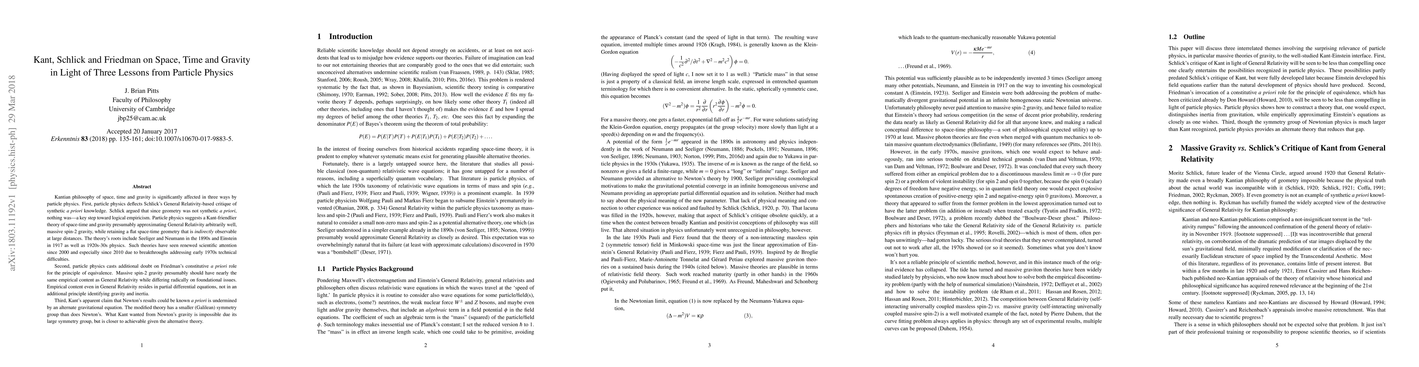 Kantian philosophy of space, time and gravity is significantly affected in three ways by particle physics. First, particle physics deflects Schlick's General Relativity-based critique of synthetic a priori knowledge. Schlick argued that since geometry was not synthetic a priori, nothing was---a key step toward logical empiricism. Particle physics suggests a Kant-friendlier theory of space-time and gravity presumably approximating General Relativity arbitrarily well, massive spin-2 gravity, while retaining a flat space-time geometry that is_indirectly_ observable at large distances. The theory's roots include Seeliger and Neumann in the 1890s and Einstein in 1917 as well as 1920s-30s physics. Such theories have seen renewed scientific attention since 2000 and especially since 2010 due to breakthroughs addressing early 1970s technical difficulties. Second, particle physics casts additional doubt on Friedman's constitutive \emph{a priori} role for the principle of equivalence. Massive spin-2 gravity presumably should have nearly the same empirical content as General Relativity while differing radically on foundational issues. Empirical content even in General Relativity resides in partial differential equations, not in an additional principle identifying gravity and inertia. Third, Kant's apparent claim that Newton's results could be known a priori is undermined by an alternate gravitational equation. The modified theory has a smaller (Galilean) symmetry group than does Newton's. What Kant wanted from Newton's gravity is impossible due its large symmetry group, but is closer to achievable given the alternative theory.