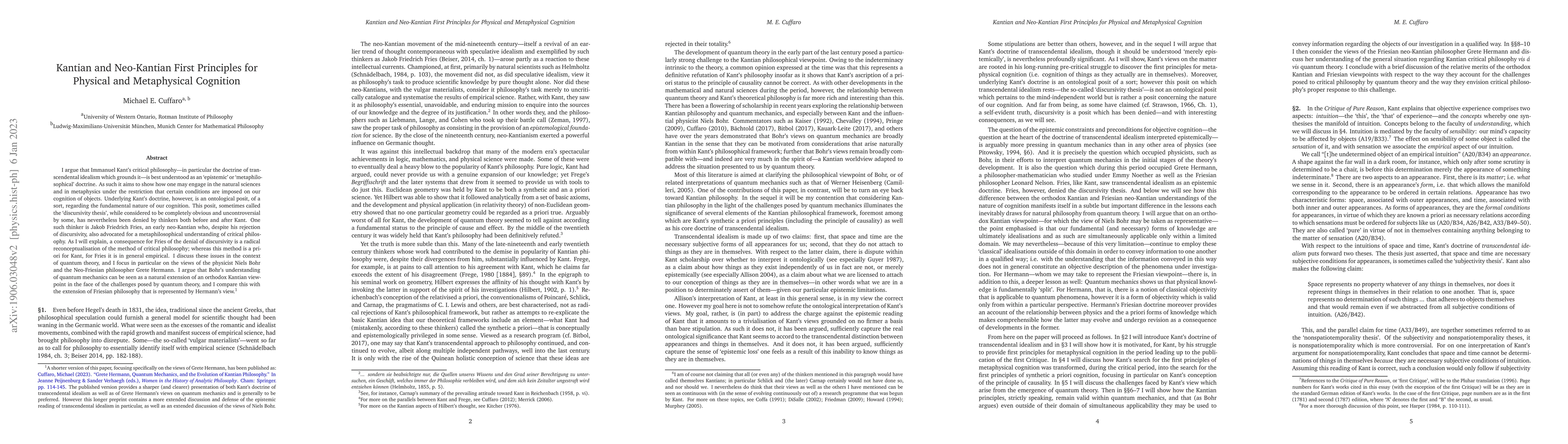 This paper explores the implications of Kant's transcendental idealism and its neo-Kantian adaptations, particularly focusing on the "discursivity thesis." It argues that while Kant's method is a priori, Fries's rejection of discursivity leads to an empirical approach, contrasting these views through the lens of quantum theory and the interpretations of Bohr and Hermann.