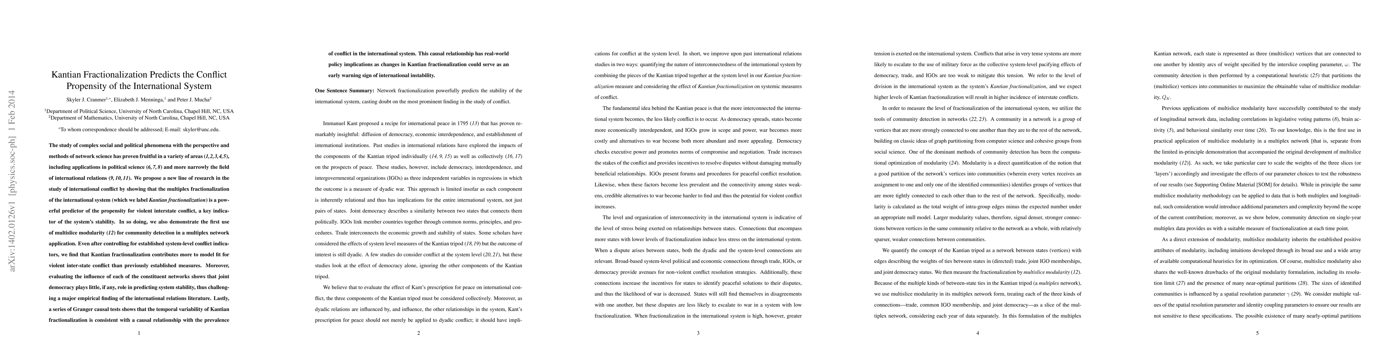 This research proposes that Kantian fractionalization—the multiplex fractionalization of international relations—is a significant predictor of violent interstate conflict, more so than established measures. It introduces multislice modularity for community detection in multiplex networks and finds that joint democracy has little effect on system stability, challenging existing literature.