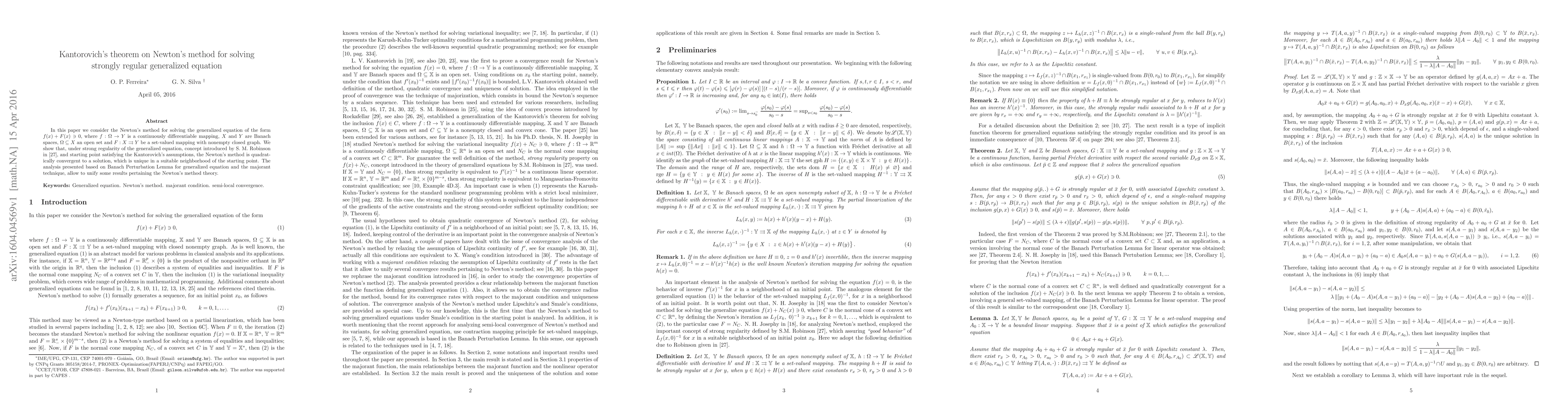 Kantorovich's theorem extends Newton's method to solve a generalized equation $f(x) +F(x) \ni 0$ in Banach spaces under strong regularity conditions, proving quadratic convergence and uniqueness of the solution in a neighborhood of the initial point. The analysis utilizes the Banach Perturbation Lemma and majorant technique.