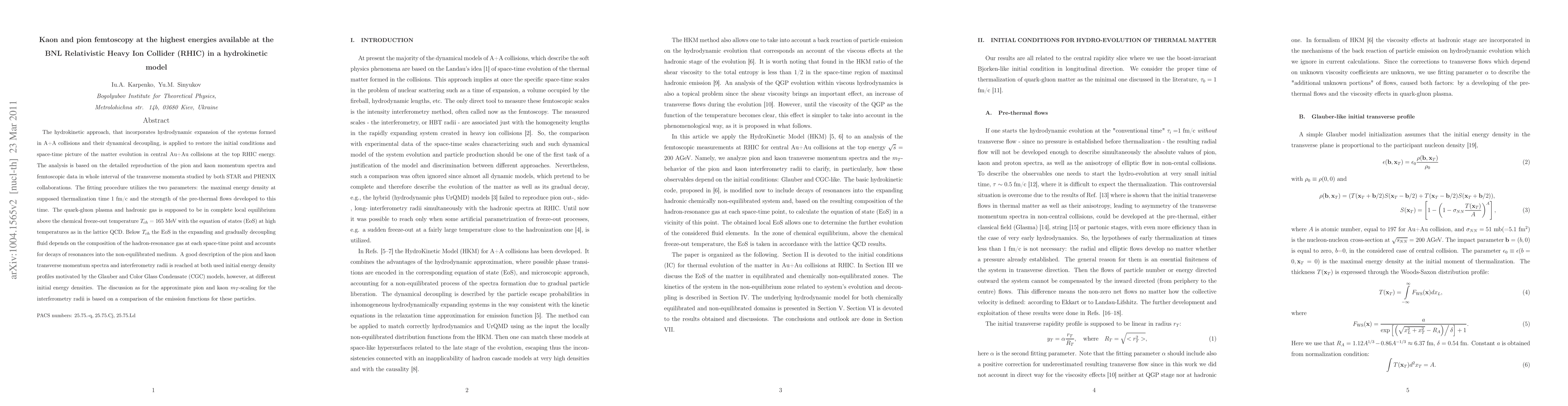 This paper applies a hydrokinetic model to analyze the evolution of matter in central Au+Au collisions at the highest RHIC energies, focusing on pion and kaon femtoscopy data. The model successfully reproduces momentum spectra and interferometry radii, suggesting the system reaches local equilibrium above a chemical freeze-out temperature of 165 MeV, with varying initial energy densities.