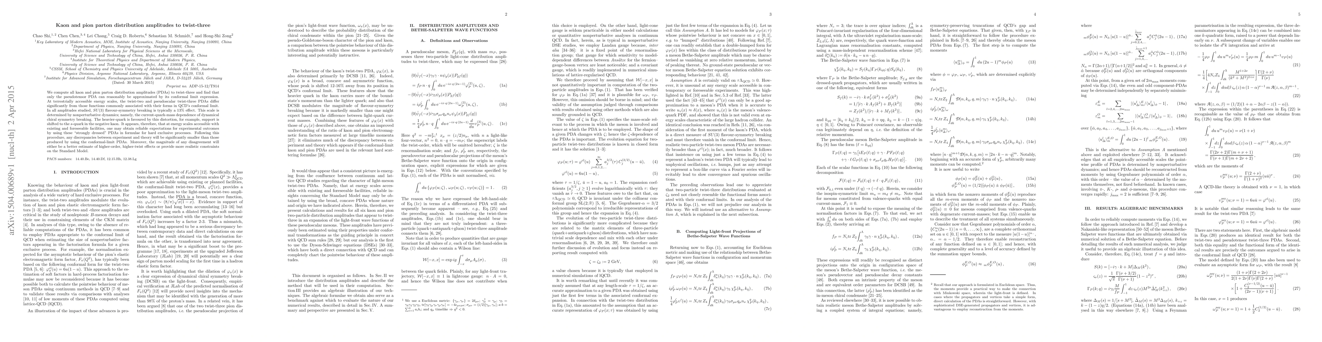 This study computes kaon and pion parton distribution amplitudes to twist-three, finding that only the pseudotensor PDA aligns with its conformal limit. At accessible energy scales, twist-two and pseudoscalar twist-three PDAs differ from QCD's conformal limit forms due to SU(3) flavor-symmetry breaking, typically a 13% effect. The research suggests using these 'strongly dressed' PDAs for hard exclusive processes to minimize discrepancies between experiment and theory, providing better estimates of higher-order effects or constraints on the Standard Model.