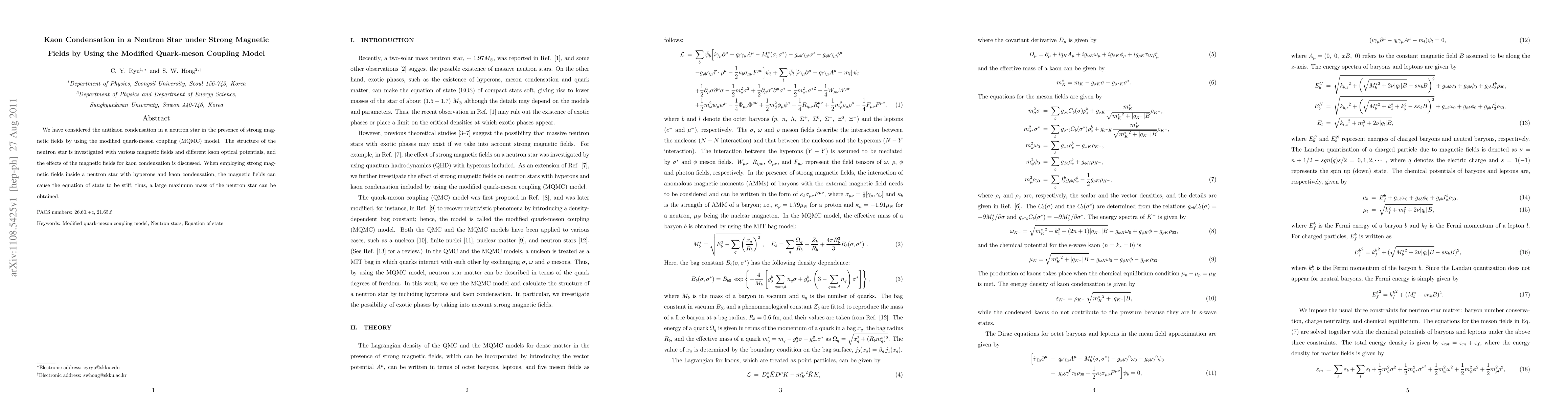 This paper investigates antikaon condensation in neutron stars under strong magnetic fields using the modified quark-meson coupling model. It finds that strong magnetic fields can stiffen the equation of state, leading to a higher maximum mass for neutron stars with hyperons and kaon condensation.