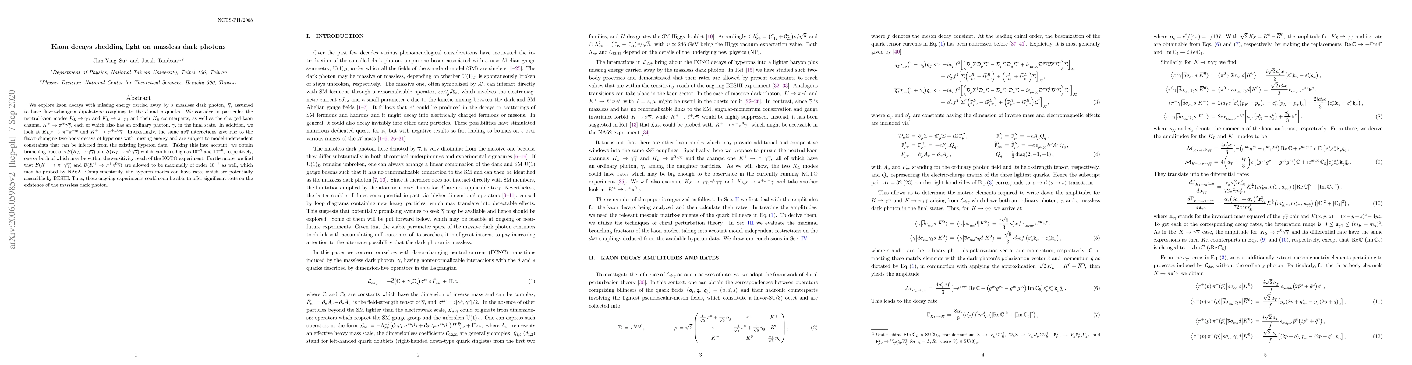 We explore kaon decays with missing energy carried away by a massless dark photon, $\bar\gamma$, assumed to have flavor-changing dipole-type couplings to the $d$ and $s$ quarks. We consider in particular the neutral-kaon modes $K_L\to\gamma\bar\gamma$ and $K_L\to\pi^0\gamma\bar\gamma$ and their $K_S$ counterparts, as well as the charged-kaon channel $K^+\to\pi^+\gamma\bar\gamma$, each of which also has an ordinary photon, $\gamma$, in the final state. In addition, we look at $K_{L,S}\to\pi^+\pi^-\bar\gamma$ and $K^+\to\pi^+\pi^0\bar\gamma$. Interestingly, the same $ds\bar\gamma$ interactions give rise to the flavor-changing two-body decays of hyperons with missing energy and are subject to model-independent constraints that can be inferred from the existing hyperon data. Taking this into account, we obtain branching fractions ${\cal B}(K_L\to\gamma\bar\gamma)$ and ${\cal B}(K_L\to\pi^0\gamma\bar\gamma)$ which can be as high as $10^{-3}$ and $10^{-6}$, respectively, one or both of which may be within the sensitivity reach of the KOTO experiment. Furthermore, we find that ${\cal B}(K^+\to\pi^+\gamma\bar\gamma)$ and ${\cal B}(K^+\to\pi^+\pi^0\bar\gamma)$ are allowed to be maximally of order $10^{-6}$ as well, which may be probed by NA62. Complementarily, the hyperon modes can have rates which are potentially accessible by BESIII. Thus, these ongoing experiments could soon be able to offer significant tests on the existence of the massless dark photon.