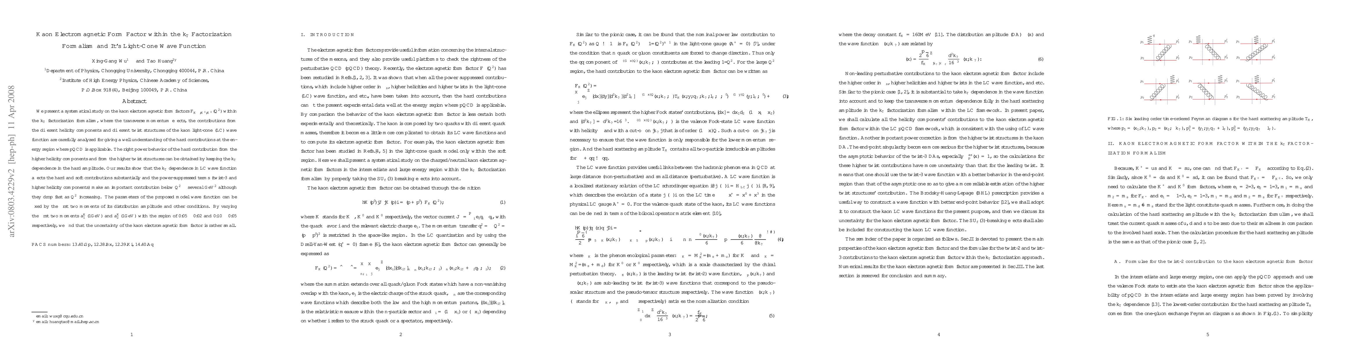 We present a systematical study on the kaon electromagnetic form factors $F_{K^{\pm},K^0,\bar{K}^0}(Q^2)$ within the $k_T$ factorization formalism, where the transverse momentum effects, the contributions from the different helicity components and different twist structures of the kaon light-cone (LC) wave function are carefully analyzed for giving a well understanding of the hard contributions at the energy region where pQCD is applicable. The right power behavior of the hard contribution from the higher helicity components and from the higher twist structures can be obtained by keeping the $k_T$ dependence in the hard amplitude. Our results show that the $k_T$ dependence in LC wave function affects the hard and soft contributions substantially and the power-suppressed terms (twist-3 and higher helicity components) make an important contribution below $Q^2\sim several GeV^2$ although they drop fast as $Q^2$ increasing. The parameters of the proposed model wave function can be fixed by the first two moments of its distribution amplitude and other conditions. By varying the first two moments $a^K_1(1GeV)$ and $a^K_2(1GeV)$ with the region of $0.05\pm0.02$ and $0.10\pm 0.05$ respectively, we find that the uncertainty of the kaon electromagnetic form factor is rather small.