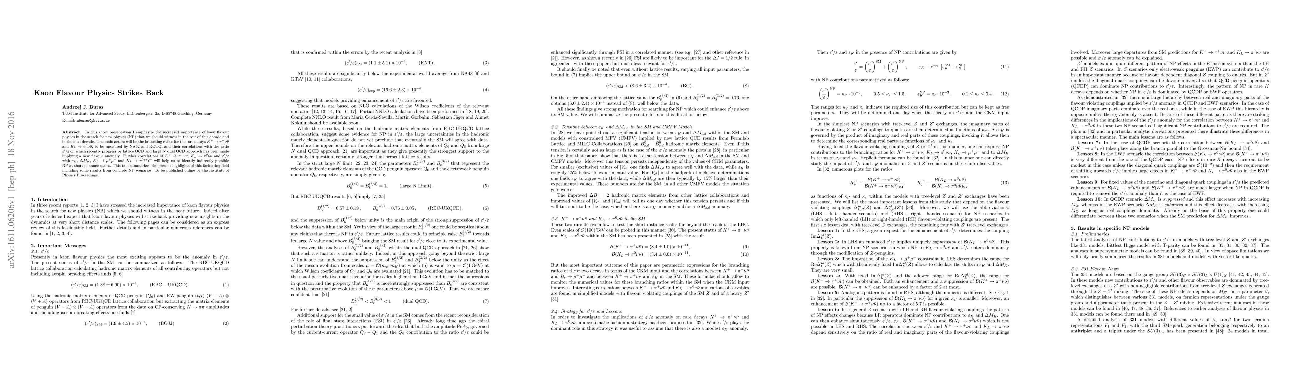 In this short presentation I emphasize the increased importance of kaon flavour physics in the search for new physics (NP) that we should witness in the rest of this decade and in the next decade. The main actors will be the branching ratios for the rare decays $K^+\rightarrow\pi^+\nu\bar\nu$ and $K_{L}\rightarrow\pi^0\nu\bar\nu$, to be measured by NA62 and KOTO, and their correlations with the ratio $\varepsilon'/\varepsilon$ on which recently progress by lattice QCD and large $N$ dual QCD approach has been made implying a new flavour anomaly. Further correlations of $K^+\rightarrow\pi^+\nu\bar\nu$, $K_{L}\rightarrow\pi^0\nu\bar\nu$ and $\varepsilon'/\varepsilon$ with $\varepsilon_K$, $\Delta M_K$, $K_L\to\mu^+\mu^-$ and $K_L\to\pi^0\ell^+\ell^-$ will help us to identify indirectly possible NP at short distance scales. This talk summarizes the present highlights of this fascinating field including some results from concrete NP scenarios.