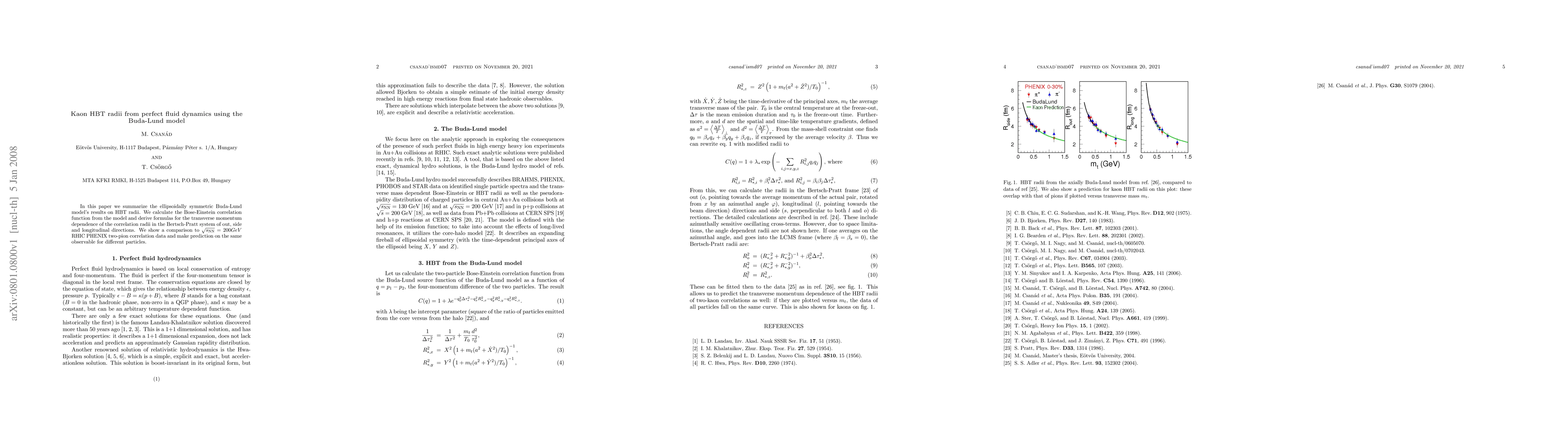 In this paper we summarize the ellipsoidally symmetric Buda-Lund model's results on HBT radii. We calculate the Bose-Einstein correlation function from the model and derive formulas for the transverse momentum dependence of the correlation radii in the Bertsch-Pratt system of out, side and longitudinal directions. We show a comparison to $\sqrt{s_{\rm NN}}=200 GeV$ RHIC PHENIX two-pion correlation data and make prediction on the same observable for different particles.