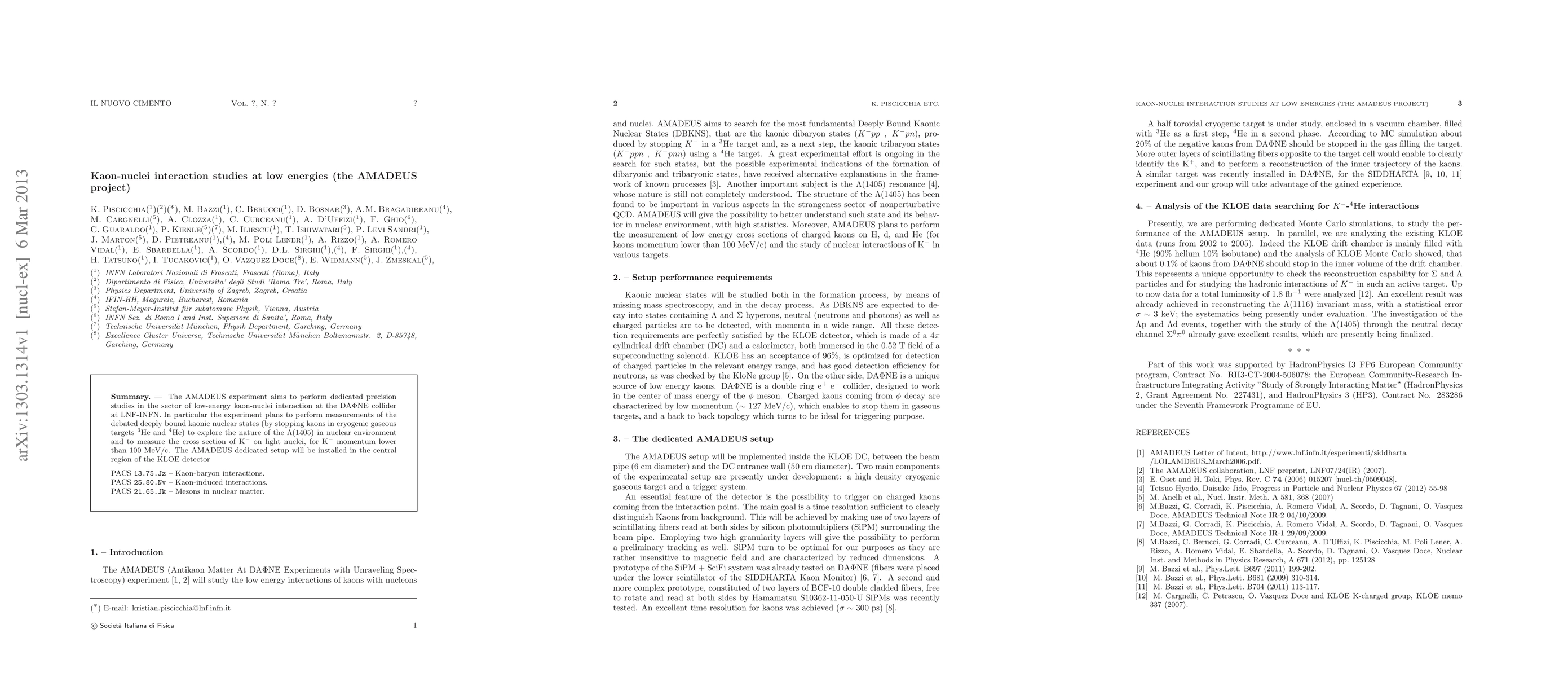 The AMADEUS experiment aims to perform dedicated precision studies in the sector of low-energy kaon-nuclei interaction at the DA\Phi NE collider at LNF-INFN. In particular the experiment plans to perform measurements of the debated deeply bound kaonic nuclear states (by stopping kaons in cryogenic gaseous targets 3He and 4He) to explore the nature of the \Lambda(1405) in nuclear environment and to measure the cross section of K- on light nuclei, for K- momentum lower than 100 MeV/c. The AMADEUS dedicated setup will be installed in the central region of the KLOE detector.