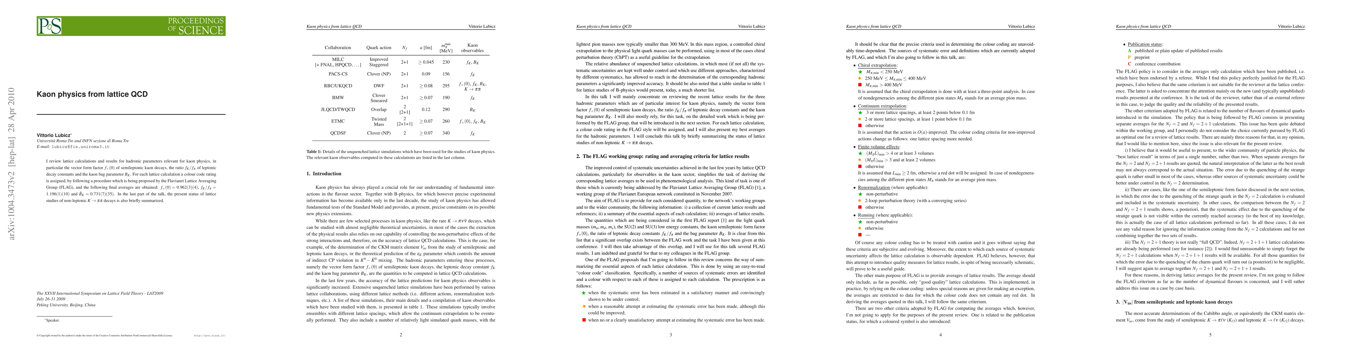 This paper reviews lattice QCD calculations for key kaon physics parameters, including the vector form factor f+(0), the ratio fK/fpi, and the kaon bag parameter BK. The study provides final averaged values and discusses the current status of non-leptonic K--> pi pi decay studies.