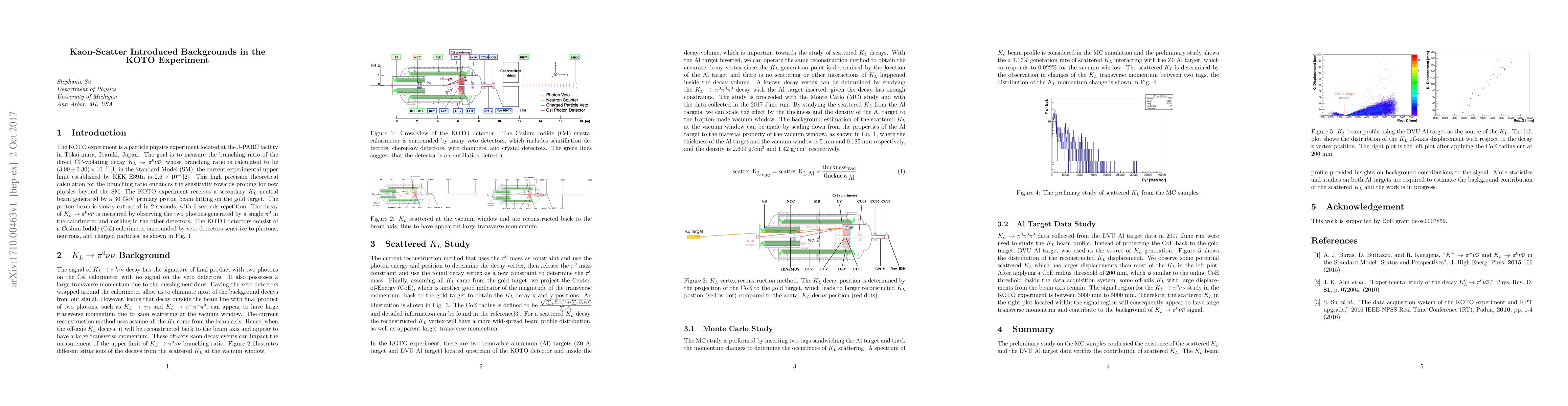 The KOTO experiment is a particle physics experiment located in J-PARC, Japan, aiming to explore physics beyond the Standard Model by measuring the branching ratio of the $K_L\rightarrow\pi^{0}\nu\bar{\nu}$ decay. This decay has not yet been observed. The branching ratio predicted by the Standard Model of $(3.0\pm0.3)\times10^{-11}$ and the current experimental upper limit established by KEK E391a is $2.6\times10^{-8}$. The signal of $K_L\rightarrow\pi^{0}\nu\bar{\nu}$ decay has the signature of two photons on the calorimeter with no signal on the veto detectors. It also has a large transverse momentum due to missing neutrinos. Kaons that decay outside the beam line with final product of two photons, such as $K_L\rightarrow\gamma\gamma$ and $K_L\rightarrow\pi^{+}\pi^{-}\pi^{0}$, can appear to have large transverse momentum due to kaon scattering and beam interaction with the detectors. These off-axis kaon decay events can impact the upper limit of $K_L\rightarrow\pi^{0}\nu\bar{\nu}$ branching ratio. Aluminum targets located at the upstream of the KOTO detector and inside the decay-volume were used to study kaon beam profile, which provided off-axis kaon decay vertex information. The beam profile provided insights on background contributions to the signal. Studies on the kaon beam profile and background identification from kaon scattering were presented in this talk.