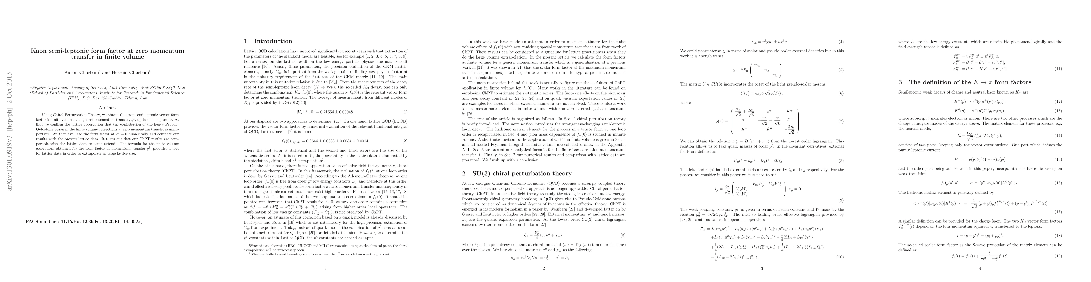 This paper uses Chiral Perturbation Theory to calculate the kaon semi-leptonic vector form factor in finite volume at zero momentum transfer, confirming that finite volume corrections from heavy Pseudo-Goldstone bosons are negligible. The results are comparable to existing lattice data, providing a useful formula for extrapolating lattice data to larger volumes.