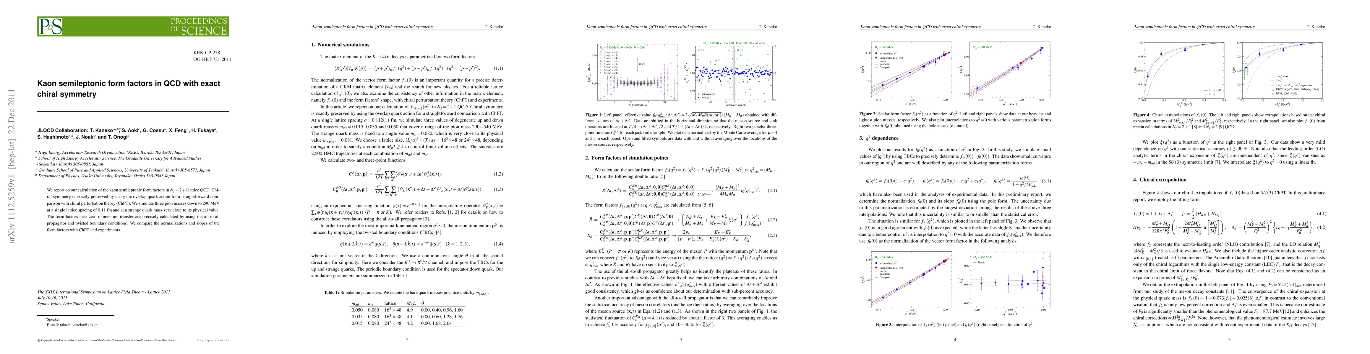 We report on our calculation of the kaon semileptonic form factors in Nf=2+1 lattice QCD. Chiral symmetry is exactly preserved by using the overlap quark action for a straightforward comparison with chiral perturbation theory (ChPT). We simulate three pion masses down to 290 MeV at a single lattice spacing of 0.11 fm and at a strange quark mass very close to its physical value. The form factors near zero momentum transfer are precisely calculated by using the all-to-all propagator and twisted boundary conditions. We compare the normalizations and slopes of the form factors with ChPT and experiments.
