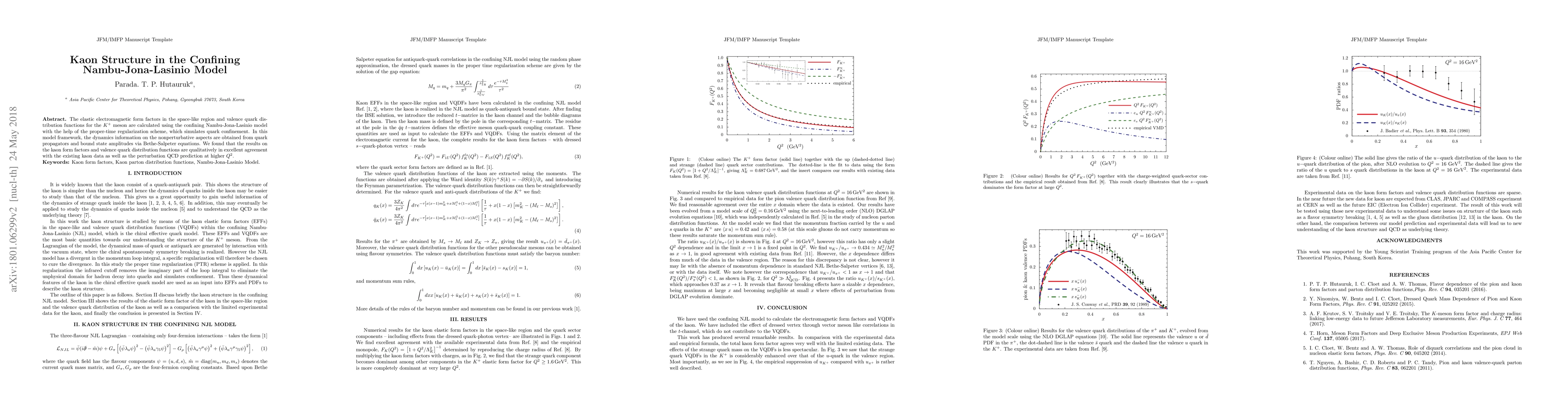 This paper calculates the elastic electromagnetic form factors and valence quark distribution functions for the K+ meson using the confining Nambu-Jona-Lasinio model, finding strong agreement with existing kaon data and perturbation QCD predictions. The study employs proper-time regularization to simulate quark confinement and derives dynamics from quark propagators and Bethe-Salpeter equations.