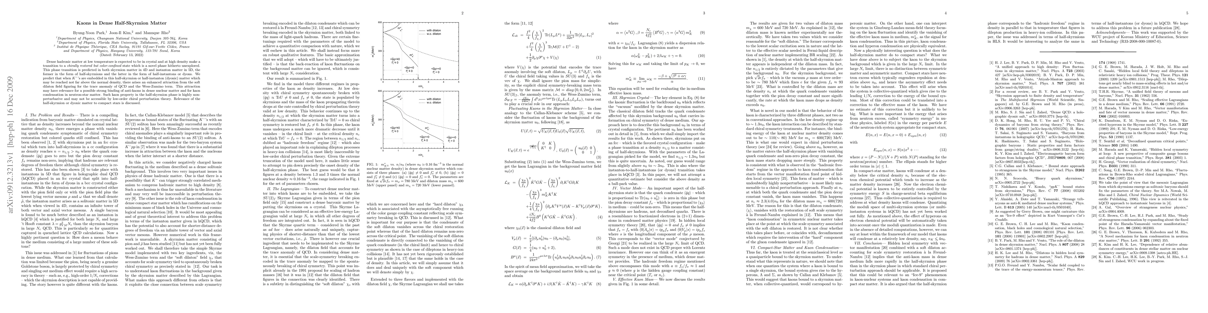 Dense hadronic matter at low temperature is expected to be in crystal and at high density make a transition to a {\em chirally restored but color-confined} state which is a novel phase hitherto unexplored. This phase transition is predicted in both skyrmion matter in 4D and instanton matter in 5D, the former in the form of half-skyrmions and the latter in the form of half-instantons or dyons. We predict that when $K^-$'s are embedded in this half-skyrmion or half-instanton (dyonic) matter which may be reached not far above the normal density, there arises an enhanced attraction from the soft dilaton field figuring for the trace anomaly of QCD and the Wess-Zumino term. This attraction may have relevance for a possible strong binding of anti-kaons in dense nuclear matter and for kaon condensation in neutron-star matter. Such kaon property in the half-skyrmion phase is highly non-perturbarive and may not be accessible by low-order chiral perturbation theory. Relevance of the half-skyrmion or dyonic matter to compact stars is discussed.